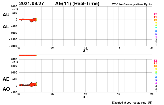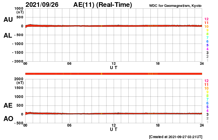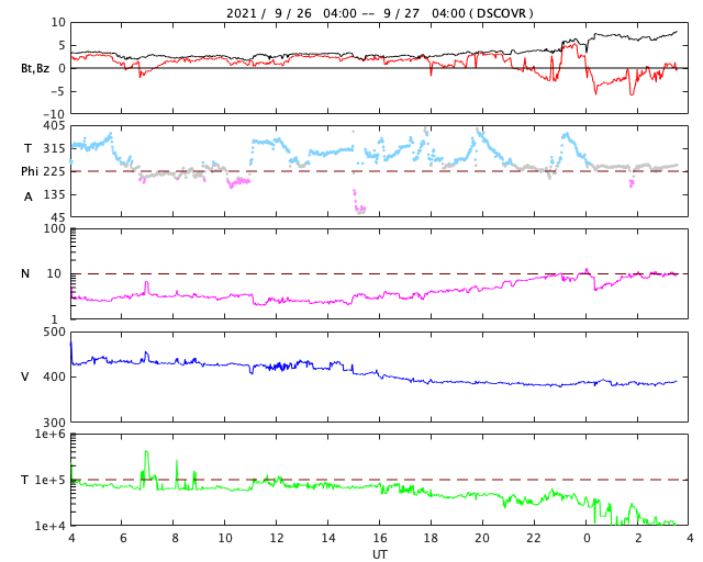 2021/ 9/27 12:44 更新 太陽風はやや低速になり、磁気圏も穏やかです。 担当 篠原 太陽風の速度は380km/秒へ下がり、 やや低速になっています。 3nT前後とやや弱い状態だった磁場強度は、 今朝くらいから少し強まって、現在は7nTです。 コロナホールの影響が近付いているのでしょうか。 磁場の南北成分は、グラフの中盤までは北寄りで、 最後に南向きに変化が発生しています。 磁気圏は穏やかな状態が続き、 グラフの最後に小規模の変化が起きているだけです。 SDO衛星AIA193では、 北半球の中緯度のコロナホールは西側に進んでいます。 この後、太陽風に変化は見られるでしょうか。 太陽は、C1の小規模フレアが2回発生した程度で、 全体としては穏やかです。 南東(左下)の黒点に、 2877、2878群と番号が付けられています。 また、北西(右上)に新しい黒点が現れています。 ![]() SDO衛星のAIA193カメラによる太陽コロナの様子 (c) SDO (NASA) ![]() SDO衛星による太陽の可視光写真。マウスの矢印を写真に重ねると、黒点番号付きの写真に切り替わります。 (c) SDO (NASA) ![]() DSCOVRが観測した太陽風の磁場(黒線は全体の強度、赤線は南北成分) 磁場の向き、プラズマの密度、速度、温度 (c) データ:NOAA/SWPC、作図:宇宙天気ニュース ![]() AE指数(速報値) 下段のAEグラフの値が高くなると、オーロラ活動が活発化しています。 (c) 京都大学WDC ![]() ![]() 27日の太陽周期に合わせたデータプロット 太陽が同じ面を地球に向けていた27日前の変化から、今後を予想することができます。 (c) 作図:宇宙天気ニュース