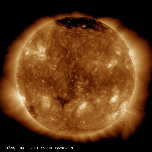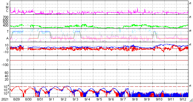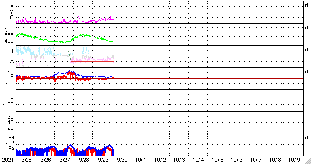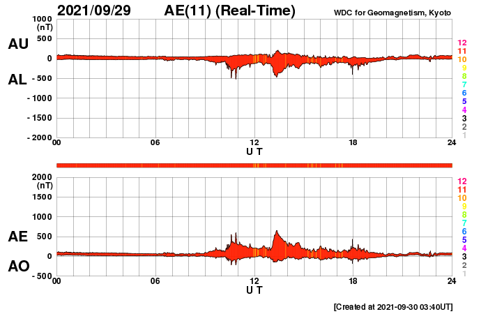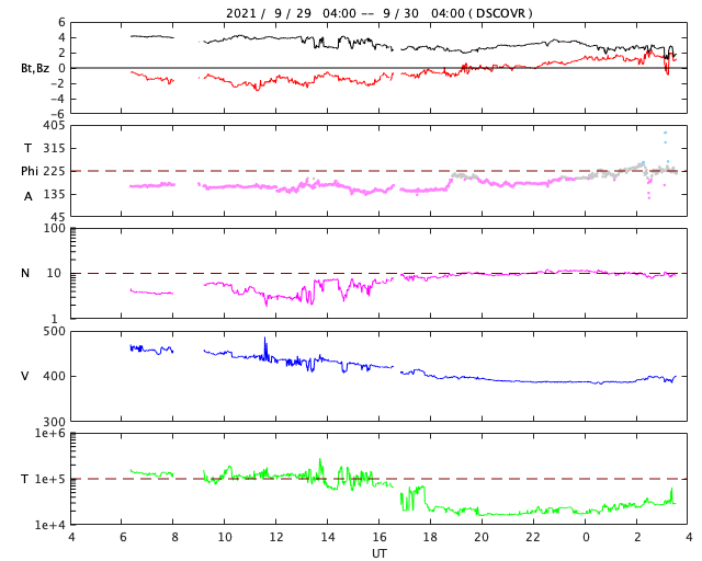 2021/ 9/30 12:44 更新 太陽風は平均的な速度に下がっています。黒点が大きくなっています。 担当 篠原 太陽風の速度は、今朝くらいに400km/秒まで下がり、 平均的な速度に戻っています。 磁場強度は、3nT程度とやや弱くなっています。 磁場の南北成分は、グラフの前半は弱い南寄りで、 後半は次第に北向きに変化しています。 このため、AE指数のグラフも、 中盤くらいに小規模の変化が続いていますが、 最後は変化がなくなっています。 SDO衛星AIA193では、 太陽の中心部に淡いコロナホールが広がっている様です。 3日後くらいに太陽風の高まりが見られるかもしれません。 また、昨日お知らせしたCMEによる太陽風の乱れが、 明日か明後日くらいに到来する可能性があります。 どの程度の変化になるでしょうか。 太陽は、北東の2880黒点群と、南西の2877黒点群が それぞれ大きくなっています。 フレアの発生も増えていて、 C1〜2と規模は小さいですが、 昨夜以降、4回記録されています。