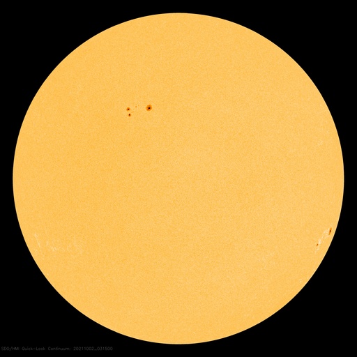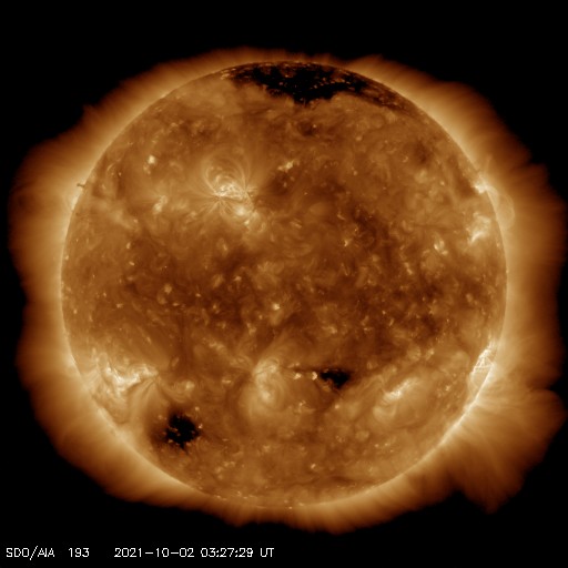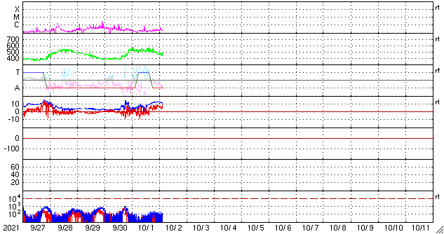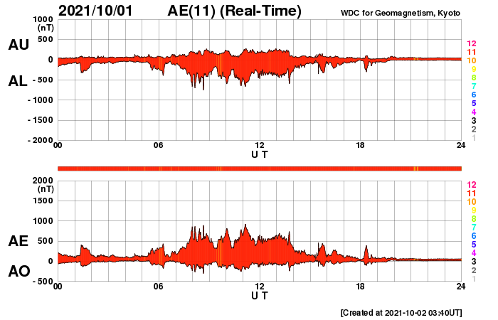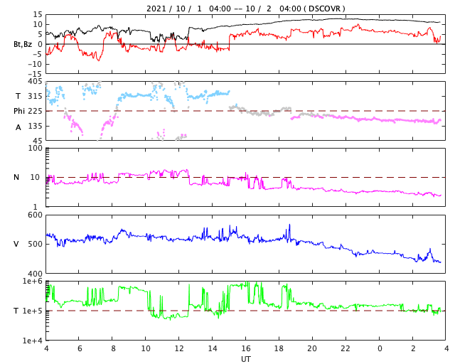 2021/10/ 2 12:59 更新 太陽風の速度は下がり始めています。 担当 篠原 太陽風の速度は、今朝早くまで500km/秒台を保っていましたが、 その後はゆっくりと下がって、現在は450km/秒です。 高速風は終わって、平均的な状態に戻りかけています。 磁場強度は、昨夜から再び強まりが到来して、 12nTくらいに強まっています。 南北成分は北向きに変化していますが、 今後、南向きに反転すれば 磁気圏の活動が強まる可能性があります。 AE指数のグラフは、 太陽風のグラフの前半の南向きの変化に対応して、 200〜600nTの小中規模の変化が発生していますが、 以降は、磁場が北向きになったため変化がなくなっています。 この後、活動が強まる様な変化が見られるでしょうか。 SDO衛星AIA193は、緯度が高めですが、 南東(左下)にコロナホールが見えています。 太陽は、特に活動はなく、 2877群と2880群が見えているだけです。 昨日紹介したフィラメント噴出に対応するCME(コロナ質量放出)は、 SOHO衛星やSTEREO Ahead衛星の画像では、 見つかりませんでした。 ![]() SDO衛星のAIA193カメラによる太陽コロナの様子 (c) SDO (NASA) ![]() SDO衛星による太陽の可視光写真。マウスの矢印を写真に重ねると、黒点番号付きの写真に切り替わります。 (c) SDO (NASA) ![]() DSCOVRが観測した太陽風の磁場(黒線は全体の強度、赤線は南北成分) 磁場の向き、プラズマの密度、速度、温度 (c) データ:NOAA/SWPC、作図:宇宙天気ニュース ![]() AE指数(速報値) 下段のAEグラフの値が高くなると、オーロラ活動が活発化しています。 (c) 京都大学WDC ![]() ![]() 27日の太陽周期に合わせたデータプロット 太陽が同じ面を地球に向けていた27日前の変化から、今後を予想することができます。 (c) 作図:宇宙天気ニュース