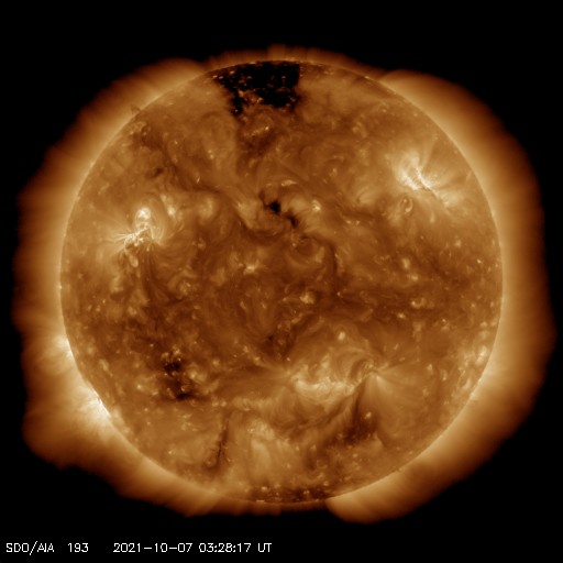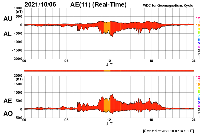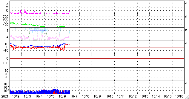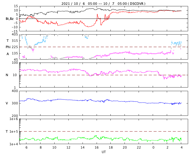2021/10/ 7 13:14 更新 太陽風磁場が南向きに変化して、磁気圏の活動が強まりました。 担当 篠原 太陽風の速度は、320km/秒から300km/秒へゆっくり下がり、 低速の状態が続いています。 磁場強度は、5nTと平均的な状態からゆっくりと強まり、 昨夜遅くには10nTを超えて、12nTまで強まりました。 現在は少し下がっていますが、9nTとまだ強まった状態です。 磁場の南北成分は、 磁場が強まり始めた頃から南向きに変化する様になり、 -10nTに達しています。 この影響で磁気圏の活動もある程度高まって、 AE指数は500〜800nTの中規模の変化が半日ほど続いています。 今日未明になると磁場は北向きに切り替わり、 以降は磁気圏も静かになっています。 太陽風磁場の強まりは、終わりに近付いている様です。 SDO衛星AIA193の太陽コロナ写真は、 北極域にコロナホールが見えていますが、 低緯度域には小さい領域が見える程度です。 太陽風は低速の穏やかな風が続きそうですが、 どうなるでしょうか。 太陽では、中心部の北東寄り(左上)の2882黒点群で、 7日11時半(世界時7日2時半)に、 C5.5の小規模フレアが発生しています。 この後の活動はどうなるでしょうか。 北西(右上)の2880黒点群は小さくなっています。 掲載の写真では、微かに見える程度です。 ![]() SDO衛星のAIA193カメラによる太陽コロナの様子 (c) SDO (NASA) ![]() SDO衛星による太陽の可視光写真。マウスの矢印を写真に重ねると、黒点番号付きの写真に切り替わります。 (c) SDO (NASA) ![]() DSCOVRが観測した太陽風の磁場(黒線は全体の強度、赤線は南北成分) 磁場の向き、プラズマの密度、速度、温度 (c) データ:NOAA/SWPC、作図:宇宙天気ニュース ![]() AE指数(速報値) 下段のAEグラフの値が高くなると、オーロラ活動が活発化しています。 (c) 京都大学WDC ![]() ![]() 27日の太陽周期に合わせたデータプロット 太陽が同じ面を地球に向けていた27日前の変化から、今後を予想することができます。 (c) 作図:宇宙天気ニュース