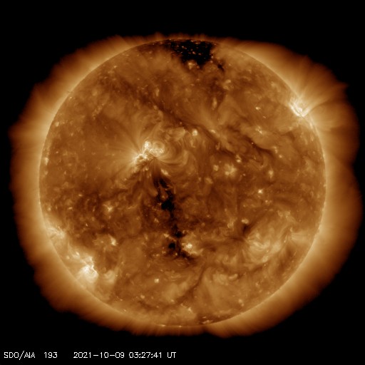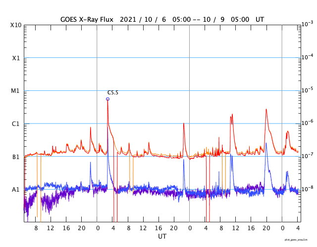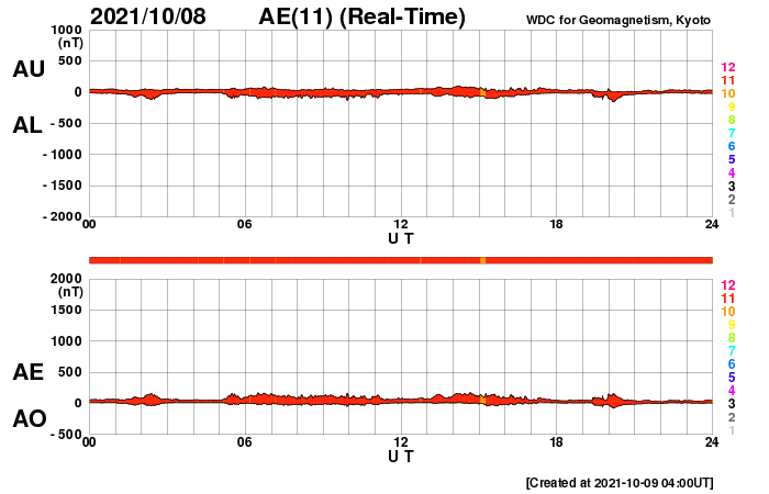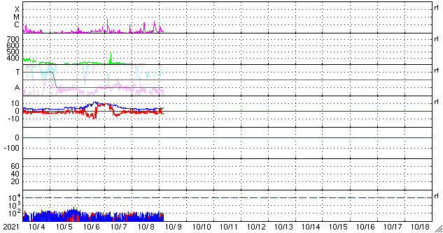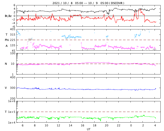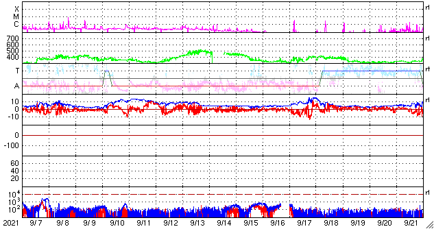 2021/10/ 9 13:24 更新 太陽風は更に低速になり、磁気圏は穏やかです。9月の黒点相対数は 51.5 でした。 担当 篠原 WDC-SILSOより、 9月の黒点相対数は、51.5 と発表されました。 黒点相対数の月平均値が50に達するのは、 2016年8月の50.2以来、5年ぶりです。 現在の第25活動周期では初めてのことで、 2019年12月の周期開始から、1年9か月での到達でした。 前周期(第24期)では、 初めて50に達したのは2011年3月の78.6と、 2008年12月に周期が始まって2年3か月後のことでした。 今期の方が半年ほど早く到達したことになります。 その一方、1枚目の図を見ると、 今回の51.5は、これまでの流れ(1年平均の赤線) からは飛び出した高さにあり、一時的な高まりになりそうです。 全体の傾向としては、前周期の2010年頃の推移と 同じくらいになっているのではないでしょうか。 9月の1か月間の黒点の変化を、2枚目に動画で掲載します。 月の前半に黒点群がより多く現れていて、 黒点相対数が70以上の日が8日連続で発生しました。 中でも、9月9日は 102 と第25期としては初めて3桁に達しました。 最後に3桁に達したのは、 第24期の終わり近くの2017年9月6日の100で、 ちょうど4年ぶりの達成です。 次は、1年平均値(赤線)が50に達するのはいつか、 月平均値が100に達するのはいつか、などに注目して下さい。 今日の太陽は、中心部の北側に2882黒点群が見えるだけです。 領域の上側で昨日よりも黒点が増えています。 この2882黒点群で、昨夜、8日20時(世界時8日11時)にC1.9、 今朝、9日4時半(世界時8日19時半)にC2.7と、 小規模フレアが2回発生しています。 SDO衛星AIA131、193による動画を掲載します。 爆発の様子から、 弱いCME(コロナ質量放出)も発生しているかもしれません。 太陽風は、速度が280km/秒とかなり遅くなっています。 磁場強度は、3〜4nTとやや弱い状態です。 磁場の南北成分は、弱い南寄りが続いていますが、 速度が大きく下がっているため磁気圏への影響は小さく、 AE指数は小さい変化が見られる程度です。 SDO衛星AIA193では、 中心部の南側に縦に伸びるコロナホールが見えています。 12日頃から、太陽風速度は高まり始めるかもしれません。