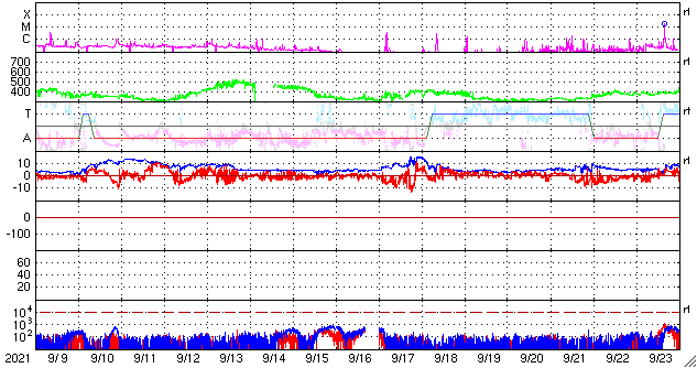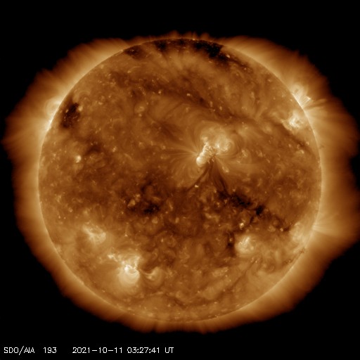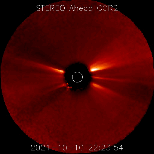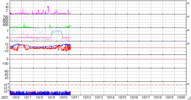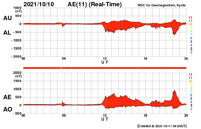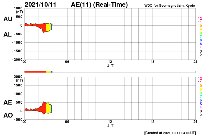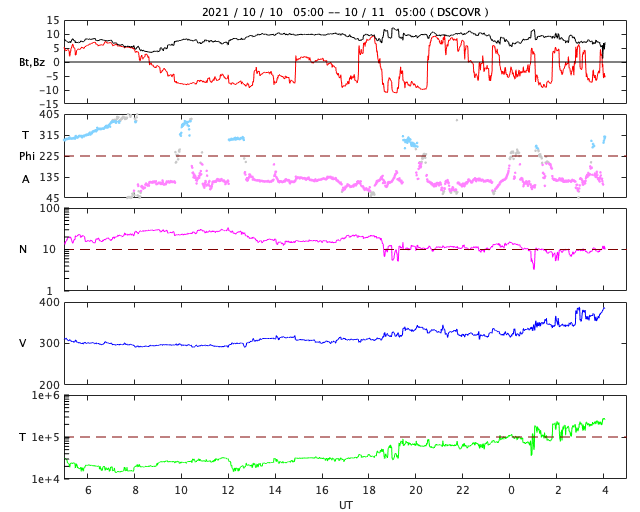 2021/10/11 13:14 更新 太陽風磁場の南向きの変化が続き、磁気圏の活動が強まっています。 担当 篠原 太陽風の磁場強度は、 7〜10nTとやや強まった状態が続いています。 速度は、300km/秒からゆっくりと上昇して、 現在も低速ですが、370km/秒くらいになっています。 昨夜から、磁場の南北成分が南向きに大きく振れるようになり、 -8nT前後の変化が続いています。 このため、磁気圏の活動もある程度高まって、 AE指数では、500〜900nTの中規模の変化が 半日ほど続いています。 太陽風の速度が少し上がってきたので、 今後は、変化の規模も少し大きくなるかもしれません。 引き続き注目してください。 SDO衛星AIA193では、 南半球のコロナホールはさらに西に進み、 影響が及び始める目安の位置に近付いています。 一方、9日に発生したCMEの影響も近付いていて、 NOAAの太陽風の予報では、 今夜、11日21時(世界時11日12時)くらいに 乱れは地球に到達するとのことで、 これから明日にかけて、 太陽風の変化とその後の磁気圏の乱れに注目してください。 太陽では、今朝、11日7時半(世界時10日22時半)に、 北西の端の向こう側(右上)でC2.3の小規模フレアが発生しています。 太陽の向こう側の現象なので、 本当の規模はこれより大きかった可能性があります。 昨日紹介したCMEと同じ領域の様で、 STEREO Ahead衛星COR2によると、 今回もCMEが飛び出している様です。 地球に対して横向きなので、影響はありません。 太陽のこちら側では、北西(右上)に2883群、 南西(右下)に2884群と黒点群が3か所に見えています。 ![]() STEREO Ahead衛星COR2によるC2.3フレアに伴うCMEの様子。 (c) STEREO (NASA)、 (動画加工 : 宇宙天気ニュース) ![]() SDO衛星のAIA193カメラによる太陽コロナの様子 (c) SDO (NASA) ![]() SDO衛星による太陽の可視光写真。マウスの矢印を写真に重ねると、黒点番号付きの写真に切り替わります。 (c) SDO (NASA) ![]() DSCOVRが観測した太陽風の磁場(黒線は全体の強度、赤線は南北成分) 磁場の向き、プラズマの密度、速度、温度 (c) データ:NOAA/SWPC、作図:宇宙天気ニュース ![]() AE指数(速報値) 下段のAEグラフの値が高くなると、オーロラ活動が活発化しています。 (c) 京都大学WDC ![]() ![]() 27日の太陽周期に合わせたデータプロット 太陽が同じ面を地球に向けていた27日前の変化から、今後を予想することができます。 (c) 作図:宇宙天気ニュース