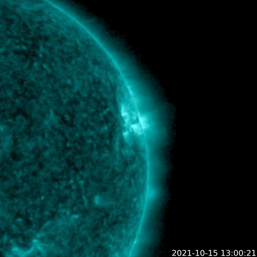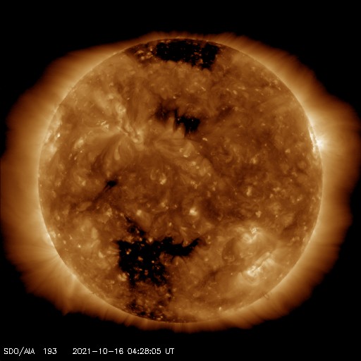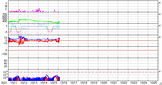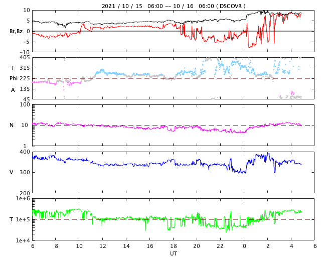 2021/10/16 14:10 更新 太陽風は低速の状態が続いています。太陽は無黒点になるかもしれません。 担当 篠原 太陽風の速度は、340km/秒とより低速になっています。 磁場強度は、4〜5nTの状態が続いていましたが、 グラフの後半で、8nTにやや強まる変化が到来しています。 磁気圏は概ね静穏ですが、 太陽風磁場が南向きに変化した時間帯に、 AE指数で300〜500nTの変化が発生しています。 SDO衛星AIA193では、 太陽の中心部の北側に小さいコロナホール、 南側に広いコロナホールが見えています。 3日後くらいから、この領域の影響で太陽風が強まりそうです。 太陽は、2882黒点群が西の端にだいぶ近付いています。 この黒点が沈むと、太陽は無黒点になるかもしれません。 X線グラフでは、B9.7とCクラスまであと少し という規模のフレアが発生しています。 2882群の向こう側にあった2885群で発生しています。 GOES衛星SUVI 131、304の動画を掲載します。 太陽の端で発生しているので、 コロナのガスの動きが良く見えています。 ![]() 太陽の西の端で発生したB9.7のフレア。GOES衛星SUVI 131、304。 (c) GOES (NOAA)、(動画加工 : 宇宙天気ニュース) ![]() SDO衛星のAIA193カメラによる太陽コロナの様子 (c) SDO (NASA) ![]() SDO衛星による太陽の可視光写真。マウスの矢印を写真に重ねると、黒点番号付きの写真に切り替わります。 (c) SDO (NASA) ![]() DSCOVRが観測した太陽風の磁場(黒線は全体の強度、赤線は南北成分) 磁場の向き、プラズマの密度、速度、温度 (c) データ:NOAA/SWPC、作図:宇宙天気ニュース ![]() AE指数(速報値) 下段のAEグラフの値が高くなると、オーロラ活動が活発化しています。 (c) 京都大学WDC ![]() ![]() 27日の太陽周期に合わせたデータプロット 太陽が同じ面を地球に向けていた27日前の変化から、今後を予想することができます。 (c) 作図:宇宙天気ニュース