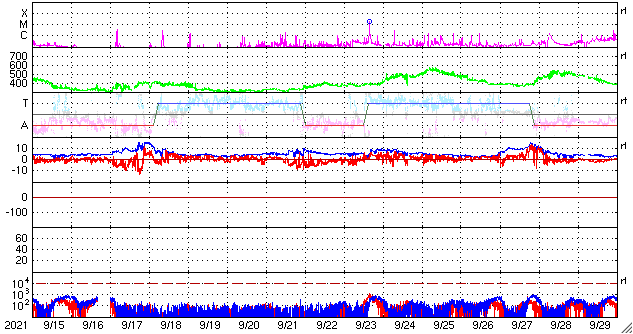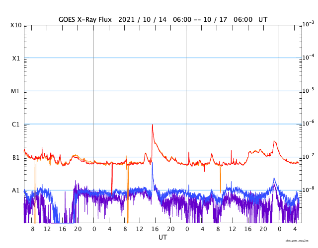 GOES衛星の太陽X線強度。赤・橙 = 0.1〜0.8 nm、青・紫 = 0.05〜0.4 nm (c) データ:NOAA/SWPC、作図:宇宙天気ニュース ![]() | ||||||||||||||||||||||||||||||||||||||||||||||||||||||||||||||||||||||||||||||||||||||||||||||||||||||||||||||||||||||||||||||||||||||||||||||||||||||||||||||||||||||||||||||||||||||||||||||||||||||||||