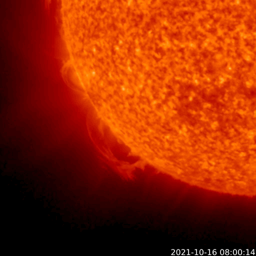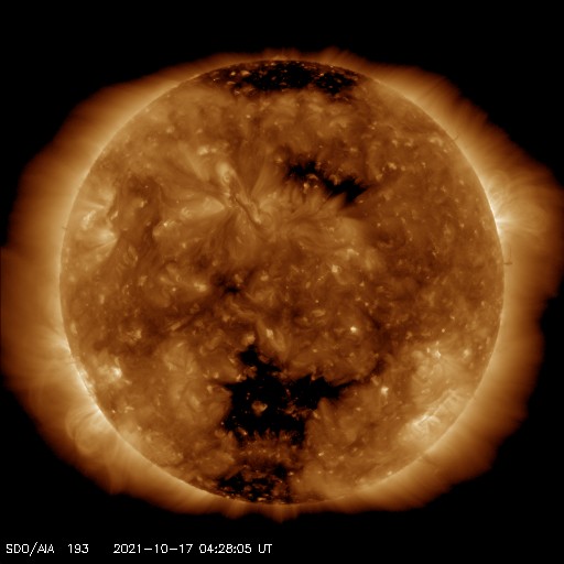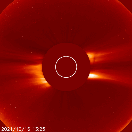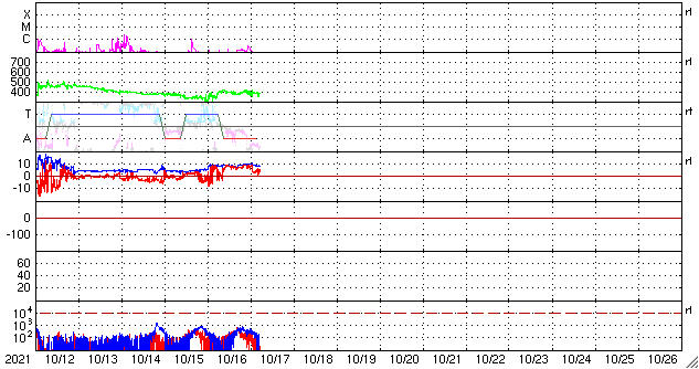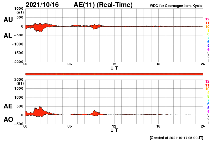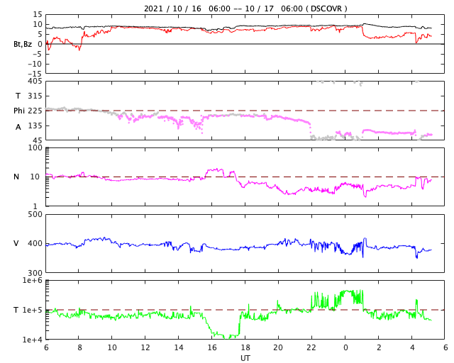 2021/10/17 14:22 更新 太陽風は平均的な速度です。磁気圏は静穏です。 担当 篠原 太陽風の速度は、昨日のニュースの後に400km/秒へ上がり、 以降、380〜400km/秒と平均的な速さになっています。 磁場強度は、9nTとやや強まった状態が続いています。 磁場の南北成分は、北向きの傾向が続いています。 このため磁気圏は穏やかで、 AE指数はほとんど変化のない状態です。 SDO衛星AIA193では、 コロナホールが西側に進んでいます。 2日後くらいから太陽風の速度が高まりそうです。 太陽は、2882黒点群が西に沈み、無黒点になっています。 昨夜、16日20時(世界時16日11時)頃に、 太陽の南東の端(左下)でフィラメント噴出が発生しました。 GOES衛星SUVI 304の動画を掲載します。 この噴出により、CME(コロナ質量放出)が 太陽の左下に向かって飛び出しています。 SOHO衛星LASCO C2、C3の動画を掲載します。 地球に対して横向きなので、影響はありません。 ![]() 太陽の南東の端で発生したフィラメント噴出。GOES衛星SUVI 304。 (c) GOES (NOAA)、(動画加工 : 宇宙天気ニュース) ![]() 太陽の左下に向かうCME。SOHO衛星LASCO C2、C3。 (c) SOHO (ESA & NASA)、 (動画加工 : 宇宙天気ニュース) ![]() SDO衛星のAIA193カメラによる太陽コロナの様子 (c) SDO (NASA) ![]() SDO衛星による太陽の可視光写真 (c) SDO (NASA) ![]() DSCOVRが観測した太陽風の磁場(黒線は全体の強度、赤線は南北成分) 磁場の向き、プラズマの密度、速度、温度 (c) データ:NOAA/SWPC、作図:宇宙天気ニュース ![]() AE指数(速報値) 下段のAEグラフの値が高くなると、オーロラ活動が活発化しています。 (c) 京都大学WDC ![]() ![]() 27日の太陽周期に合わせたデータプロット 太陽が同じ面を地球に向けていた27日前の変化から、今後を予想することができます。 (c) 作図:宇宙天気ニュース