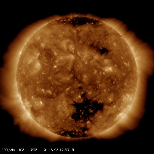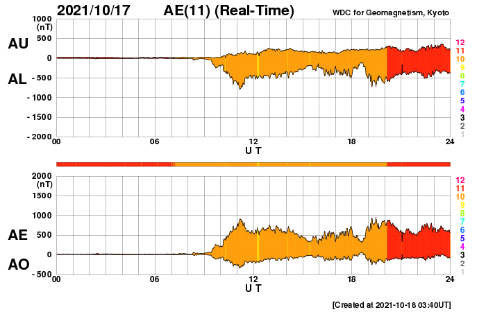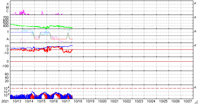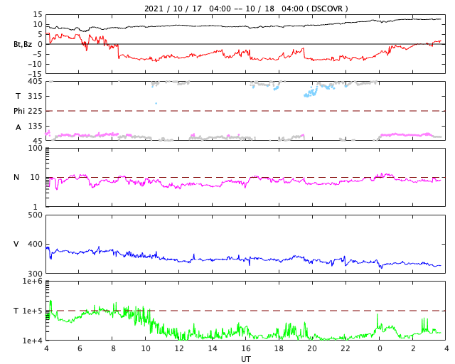 2021/10/18 12:59 更新 太陽風は低速になっています。新しい黒点が現れています。 担当 篠原 太陽風の速度は、400km/秒から330km/秒へ下がり、 低速の風に変わっています。 9nTにやや強まっていた磁場強度は、 今朝くらいに10nTを超え、現在は13nTに強まっています。 磁場の南北成分は、 昨日のニュースの頃は北向きでしたが、 その後、南向きに切り替わり、 -8nT程度の南向きの状態が今朝まで続きました。 このため、磁気圏の活動は強まり、 AE指数のグラフは、 途中から500〜800nTの中規模の変化が 連続するようになっています。 現在の太陽風磁場南北成分は0nT付近になり、 南向きの変化が見られなくなっています。 磁気圏の活動は次第に弱くなりそうです。 SDO衛星AIA193ではコロナホールが西に進み、 地球に影響が及び始める目安の位置に近付いています。 今後は、太陽風速度の上昇にも注目してください。 太陽は、南東の端(左下)から新しい黒点が現れています。 今のところ活動は特に見られず、 比較的穏やかな状態の様です。