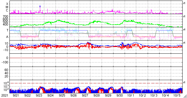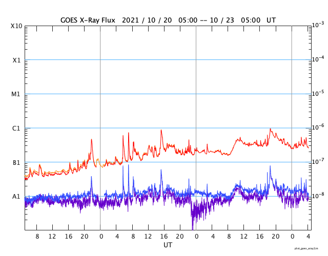 GOES衛星の太陽X線強度。赤・橙 = 0.1〜0.8 nm、青・紫 = 0.05〜0.4 nm (c) データ:NOAA/SWPC、作図:宇宙天気ニュース ![]() | ||||||||||||||||||||||||||||||||||||||||||||||||||||||||||||||||||||||||||||||||||||||||||||||||||||||||||||||||||||||||||||||||||||||||||||||||||||||||||||||||||||||||||||||||||||||||||||||||||||||||||||||||