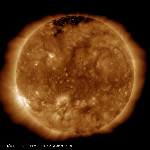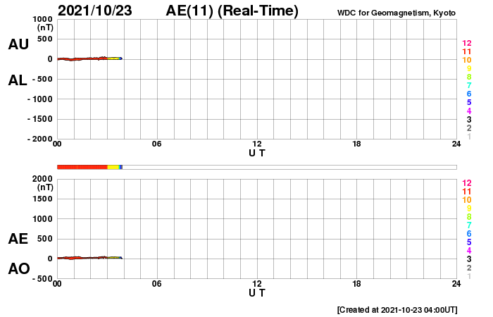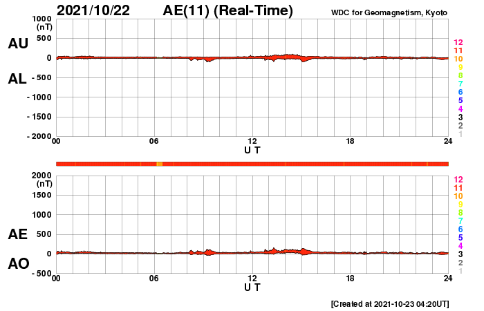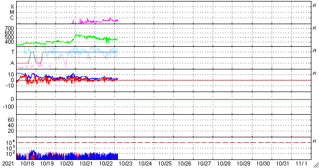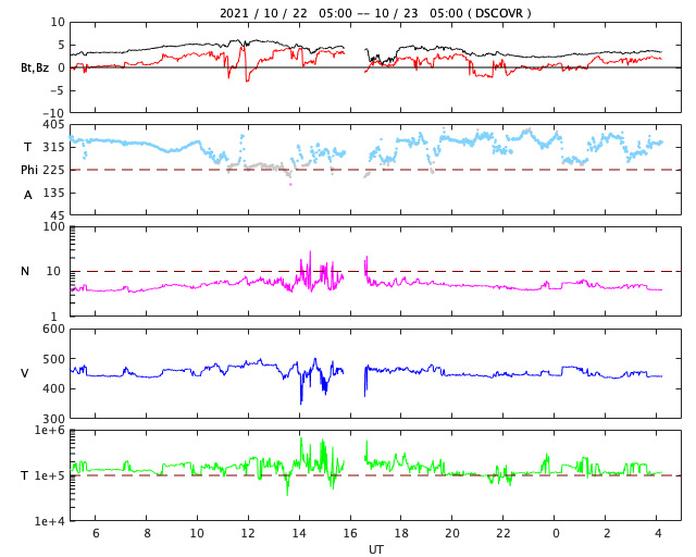 2021/10/23 13:27 更新 太陽風は平均的な速度に戻っています。 担当 篠原 太陽風は、450km/秒と平均的な速さに戻っています。 磁場強度は、3nTから5nTに少し上がり、 再び3nTに戻る変化をしています。 現在はやや弱い状態です。 磁場の南北成分は、比較的北寄りになっています。 磁気圏は静穏で、AE指数はほとんど変化がありません。 SDO衛星AIA193では、北極以外にコロナホールは見られず、 太陽風は穏やかな状態が続きそうです。 太陽は、南東から現れた黒点に、 2887群と番号が付けられています。 Bクラスの小さいフレアが発生している程度で、 活動度は特に高くはない様です。 一方、太陽の東端の向こう側で別の領域の活動が発生していて、 SDO衛星AIA131で、フレアの小さい輝きが観測されたり、 SOHO衛星で、CMEが観測されたりしています。 STEREO Ahead衛星によると、 南東(左下)から活動的な領域が2か所現れ、 続いて、北東(左上)からも現れそうです。 今後の活動の高まりに注目してください。