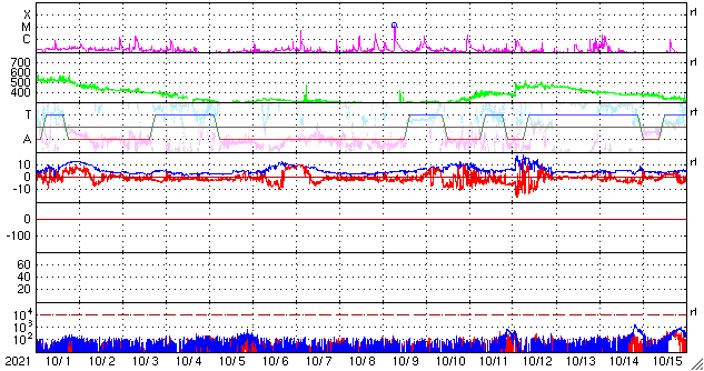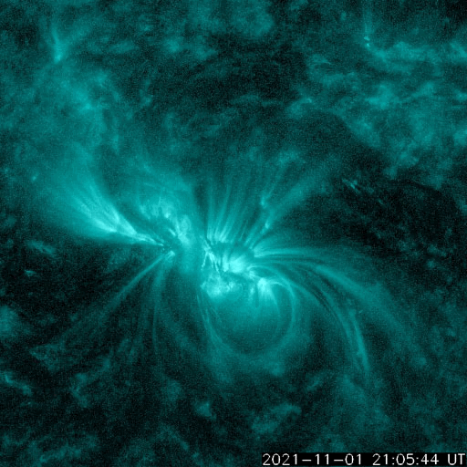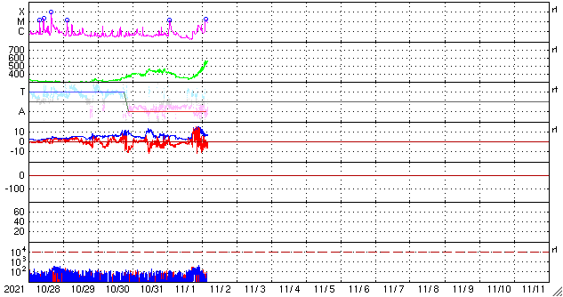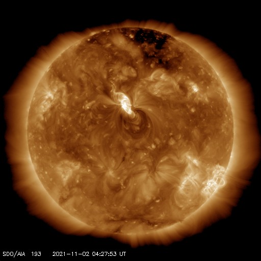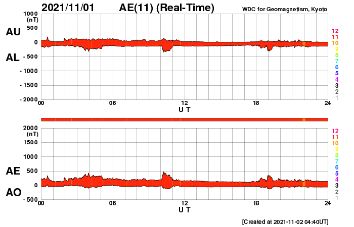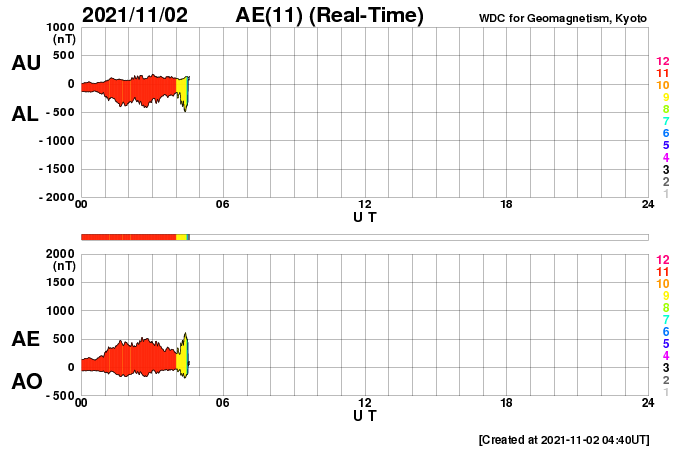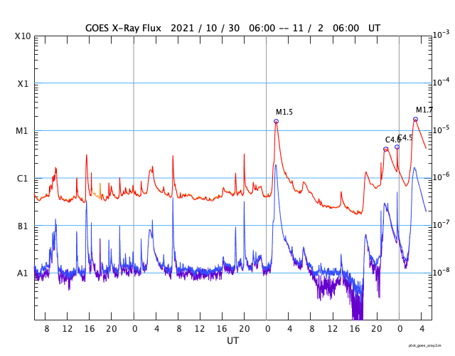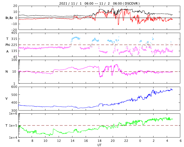 2021/11/ 2 14:04 更新 M1.7の中規模フレアが発生しました。太陽風の速度は550km/秒に高まっています。 担当 篠原 太陽の中心部の2891黒点群で、 2日10時半(世界時2日1時半)に、 M1.7の中規模フレアが発生しました。 まだ変化の途中ですが、 SDO衛星AIA131、193による動画を掲載します。 フレアの様子から、 CME(コロナ質量放出)も発生している可能性があります。 その場合、中心近くで発生しているので、 飛び出したガスは地球にも向かっていると思われます。 発生から3〜4日程度かかると考えると、 5日か6日頃に太陽風の乱れが到来する可能性があります。 磁場の南向きの強まりが発生すると、 オーロラの活動が強まることが考えられます。 注目してください。 2891群では、 この前にもC2.1、C4.5の小規模フレアが発生しています。 また、南西(右下)の2887黒点群では、 昨日朝のM1.5フレアに続いて、 今朝、2日6時(1日21時)にC4.0の小規模フレアを起こしています。 どちらもCMEが南西(右下)に飛び出していて、 地球に対しては斜め方向ですが、影響が見られるかもしれません。 太陽風は、今日未明から磁場の強まりと速度の上昇が発生し、 磁場は、4nTから15nTに強まって,現在は5nTへ下がっています。 速度は、350km/秒からゆっくりと高まって、 現在は550km/秒と高速の状態に変わっています。 磁場の南北成分は、 速度が高まった頃から南寄りになっています。 このため、AE指数は500nT程度の変化が見られる様になっています。 この後もやや活動的な状態が続くかもしれません。 この高速風は、SDO衛星AIA193の太陽コロナ写真で、 北極から縦に伸びていたコロナホールの影響かもしれません。 速度の高まりがどのくらい続くか、注目してください。