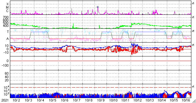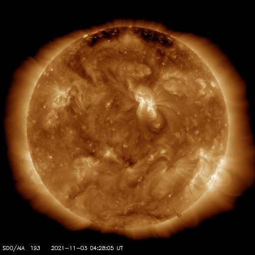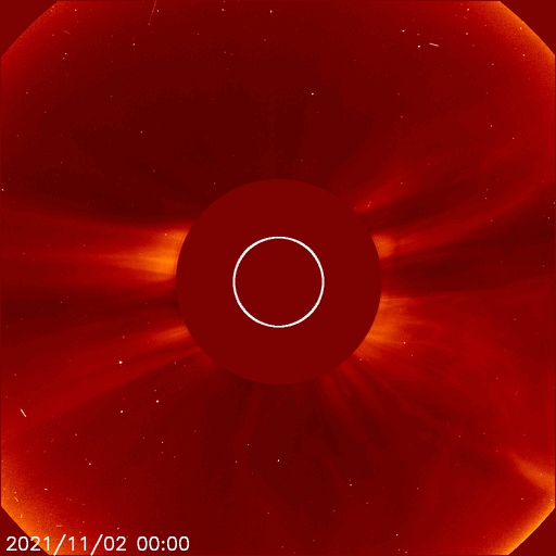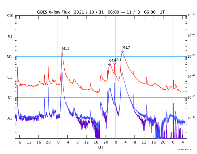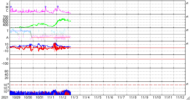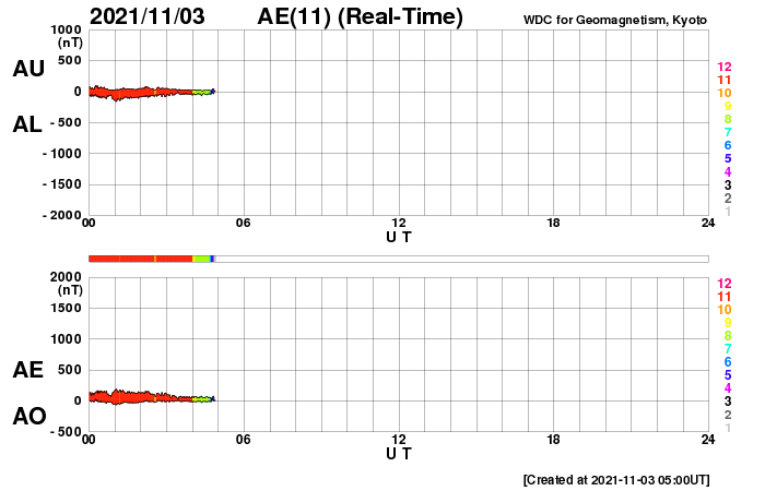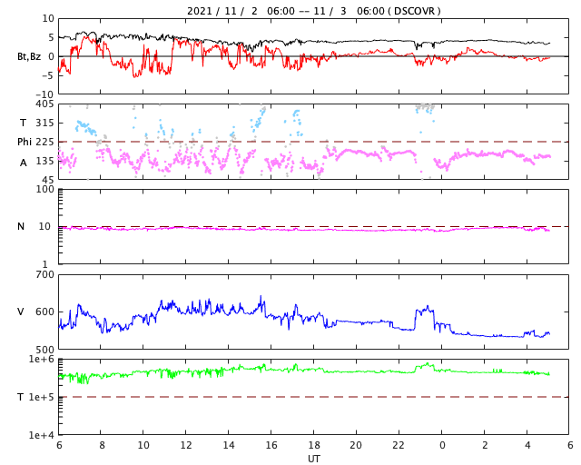 2021/11/ 3 14:11 更新 高速の太陽風が続いています。CMEによる太陽風の乱れが近付いています。 担当 篠原 昨日のM1.7フレアについて、 今日はSDO衛星AIA171による動画を掲載します。 このカメラでは、 フレアの後のループ状のプロミネンスがきれいに見えます。 昨日の動画は発生直後で終わってしまいましたが、 今回はたっぷり24時間分です。 SOHO衛星では、 このフレアに伴って発生したCMEが撮影されています。 LASCO C2、C3の動画を見ると、 太陽の上半分に少し偏りながら、 全体を囲むようにガスが広がっています。 このため、太陽風の乱れは地球の方向にも飛び出しています。 NOAA/SWPCの予報によると、 明日の朝、4日6時(世界時3日21時)くらいに 地球に到来する可能性があるとのことです。 2日かからないとすると、速度もだいぶ高まりそうです。 どのタイミングで乱れがやって来るか、注目してください。 Mフレア以降の太陽は穏やかで、 小さいフレアが起きている程度です。 2887黒点群は、西の端に沈みかけています。 太陽風は、昨夜には600km/秒まで速度が高まっています。 今日に入るとゆっくりと下がって、 現在は530km/秒ですが、依然、高速の状態が続いています。 磁場強度は、5nTから4nTへ少し下がっています。 磁場の南北成分は、グラフの前半は南北に変化が見られ、 速度が高まっていることもあって、磁気圏の活動は強まり、 AE指数では最大1400nTの大きな変化も発生しています。 グラフの後半からは、 0nT付近で小さく変化する様に傾向が変わっています。 AE指数も同様に、最後は変化が見られなくなっています。 太陽風の高まりは後半に入っている様ですが、 この後は、CMEによる乱れの到来に注目してください。
