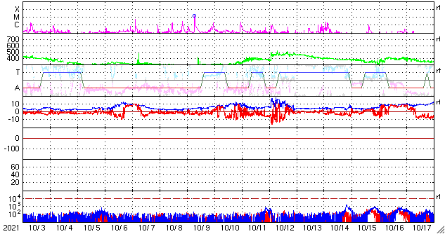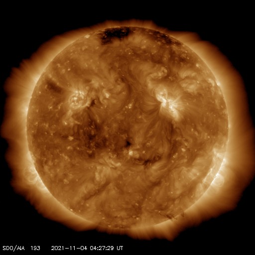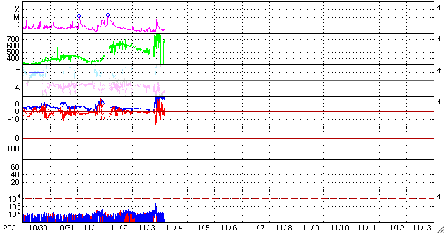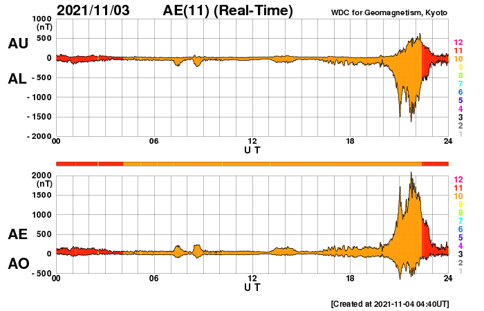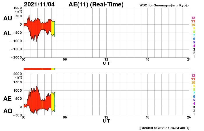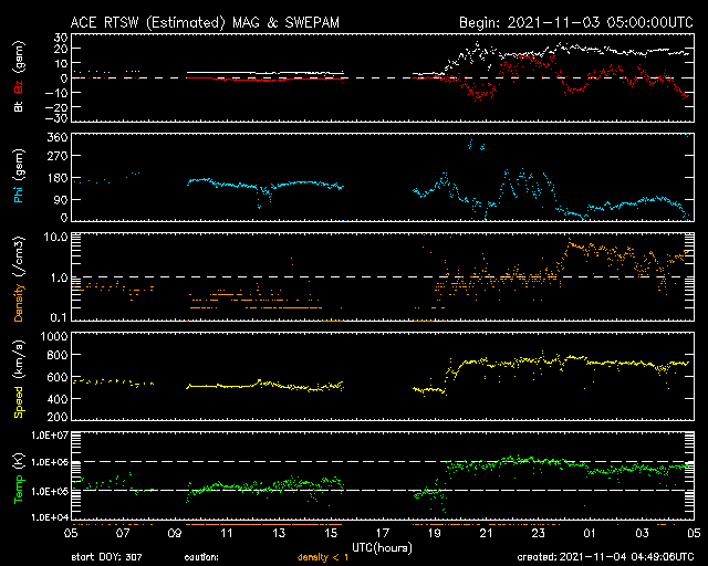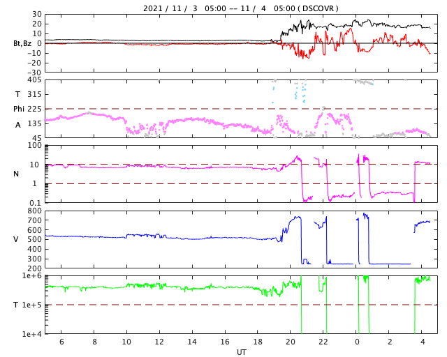 2021/11/ 4 13:49 更新 今朝、太陽風の乱れが到来し、磁気圏の活動も強まっています。 担当 篠原 今朝、4日4時半(世界時3日19時半)に、 太陽風の乱れがDSCOVR衛星で観測されました。 太陽風の速度は、 それまでも500km/秒と高速の状態だったのですが、 乱れの到来後は750km/秒に高まっています。 (DSCOVR衛星のグラフでは、速度データの欠測が目立つので、 ACE衛星のグラフも掲載します) 磁場強度は、3nTとやや弱い状態から、 20nTへ強まっています。 太陽風磁場の南北成分は、 乱れの初めの頃に-10nTを超える南向きの変化が発生しました。 速度の高まりもあり、磁気圏の活動は強まって、 AE指数では2000nTに達する激しい変化が発生しています。 その後も、AE指数は1000nT前後の 活発な変化が続いています。 今回の太陽風の乱れは、 M1.7フレアから2日弱で到着しました。 元々の太陽風が高速の状態だったことも 影響しているのではないでしょうか。 到来から10時間ほど経った現在の太陽風は、 速度は700km/秒、磁場強度は16nTと強まった状態が続いています。 引き続き、磁気圏活動の高まりとともに注目してください。 太陽では、2887黒点群が南西の端に沈みました。 沈むところでC5.2の小規模フレアを起こしています。 残っている2891、2893群は、穏やかな状態ですが、 南東の端から新しい領域が近づいている様です。