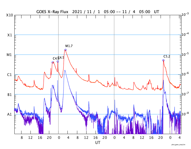 GOES衛星の太陽X線強度。赤・橙 = 0.1〜0.8 nm、青・紫 = 0.05〜0.4 nm (c) データ:NOAA/SWPC、作図:宇宙天気ニュース ![]() | |||||||||||||||||||||||||||||||||||||||||||||||||||||||||||||||||||||||||||||||||||||||||||||||||||||||||||||||||||||||||||||||||||||||||||||||||||||||||||||||||||||||||||||||||||||||||||||||||||||||||||||||||||||||||||||
