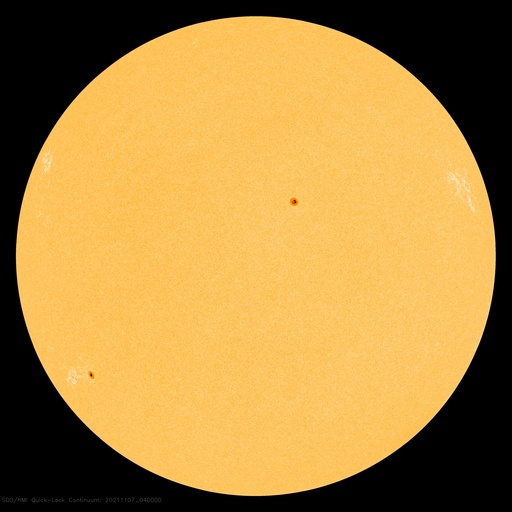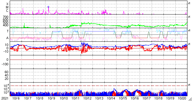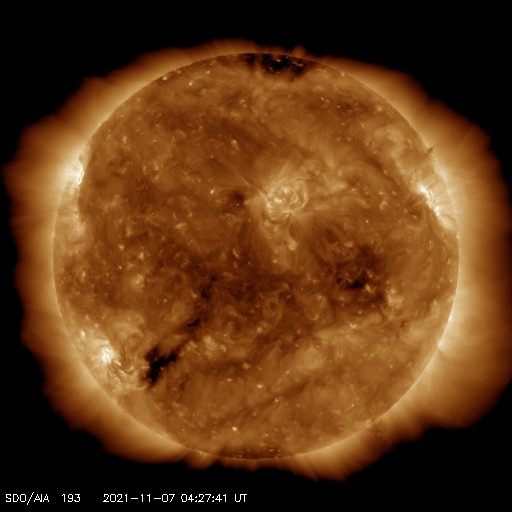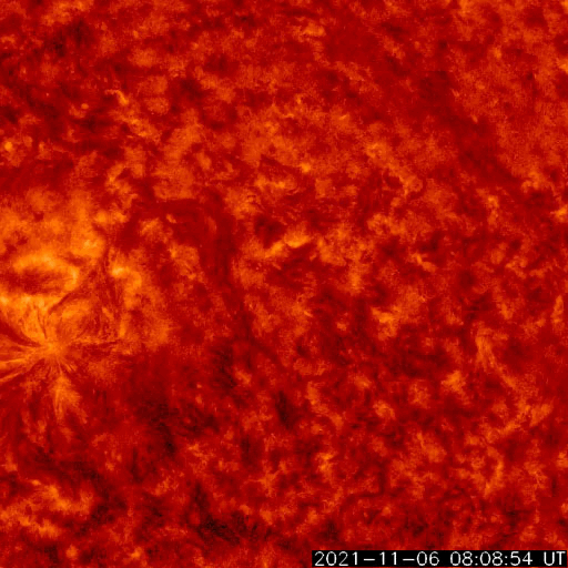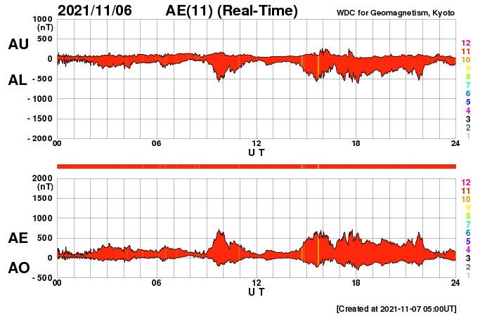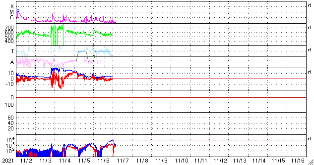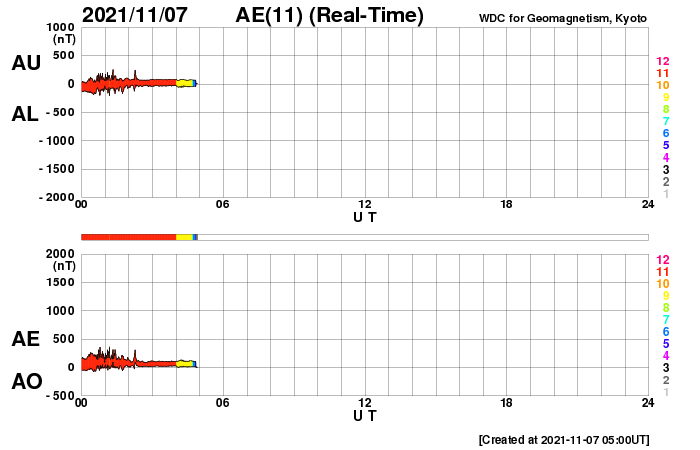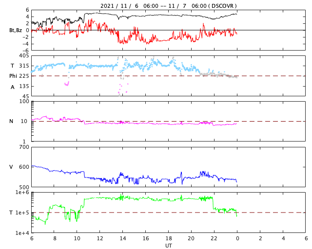 2021/11/ 7 14:07 更新 太陽風は高速の状態が続いています。 担当 篠原 昨日、600km/秒台に高まっていた太陽風の速度は、 夜になると500km/秒台中盤に下がり、 現在は520km/秒と高速の状態は続いています。 太陽風の磁場強度は4nTと平均的な状態で、 磁場の南北成分は南寄りの状態がしばらく続きました。 このため、磁気圏はある程度活動的になって、 AE指数は500nT前後の変化が発生しています。 その後、磁場は北寄りに変わり、 AE指数の変化も小さくなっています 太陽は、北東の端(左上)から活動的な領域が現れましたが、 黒点は見えていません。 南西(左下)の2894黒点群でC1.7の小規模フレアと Bクラスの小さいフレアが頻繁に発生しています。 規模が大きくなるようであれば、注目です。 昨夜、6日20時(世界時6日11時)頃に、 太陽の中心部でフィラメント噴出が発生しました。 SDO衛星AIA304の動画を掲載します。 弱いCME(コロナ質量放出)が発生しているかもしれません。