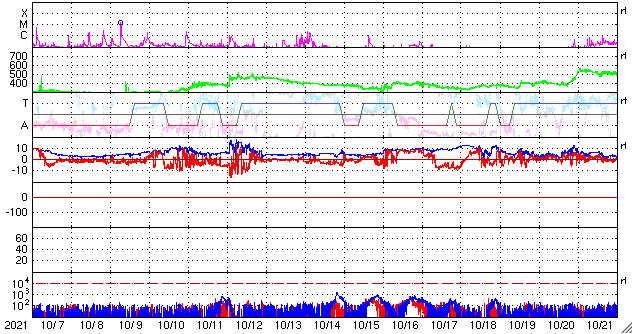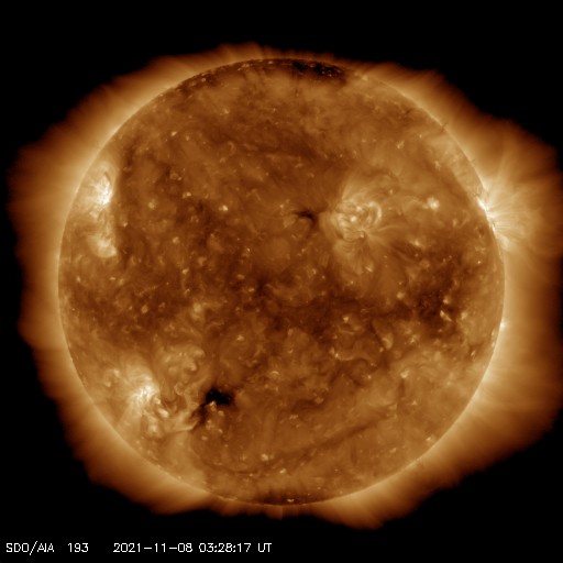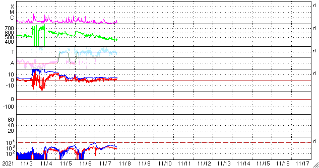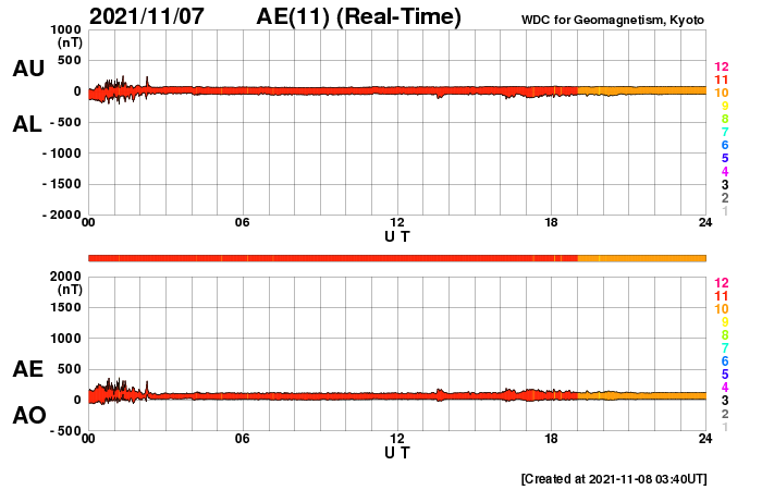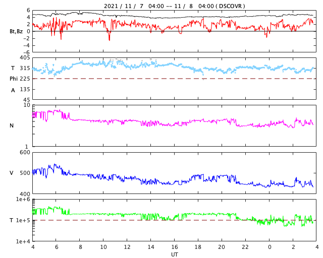 2021/11/ 8 12:59 更新 太陽風は平均的な速度に戻りました。磁気圏は穏やかです。 担当 篠原 太陽風の速度は昨夕に500km/秒台を割り、 現在は440km/秒と平均的な速さに戻っています。 磁場強度も、5nT前後と平均的な状態です。 磁場の南北成分は、弱い北寄りが続いています。 磁気圏は穏やかになっていて、 AE指数はほとんど変化のない状態です。 SDO衛星AIA193の太陽コロナ写真は、 小さいコロナホールが見えるくらいです。 この後、太陽風は穏やかになりそうです。 太陽は、北東(左上)の活動的な領域に黒点が現れています。 北西の端(右上)近くでB7.1の小さいフレアが発生した程度で、 活動は穏やかになっています。 昨日紹介したフィラメント噴出の後、 SOHO衛星やSTEREO Ahead衛星の画像では、 CME(コロナ質量放出)は確認できませんでした。