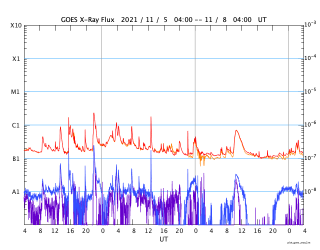 GOES衛星の太陽X線強度。赤・橙 = 0.1〜0.8 nm、青・紫 = 0.05〜0.4 nm (c) データ:NOAA/SWPC、作図:宇宙天気ニュース ![]() | ||||||||||||||||||||||||||||||||||||||||||||||||||||||||||||||||||||||||||||||||||||||||||||||||||||||||||||||||||||||||||||||||||||||||||||||||||||||||||||||||||||||||||||||||||||||||||||||||||||||||||||||||||||||