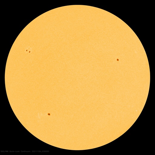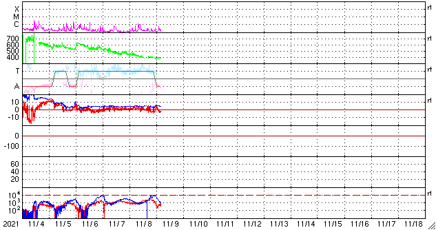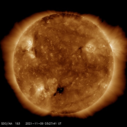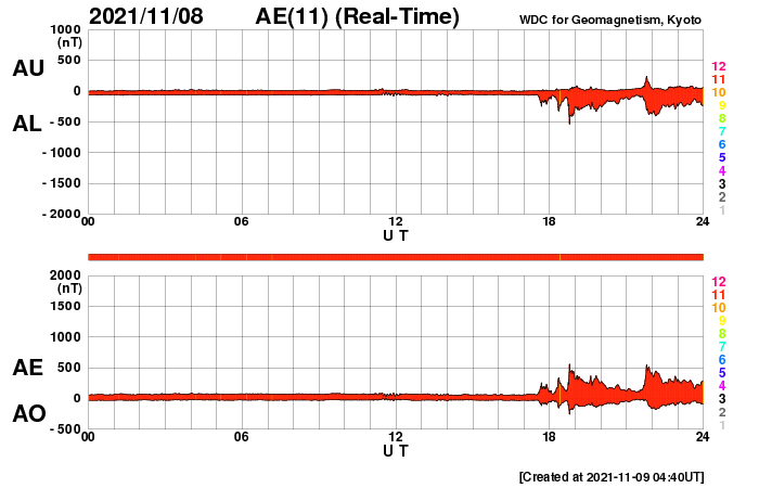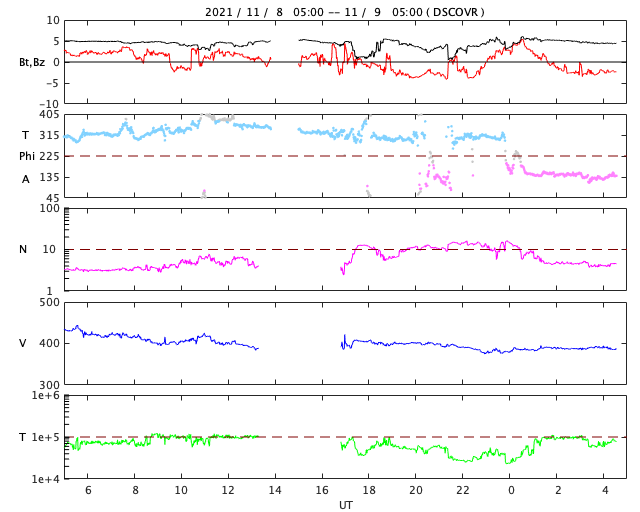 2021/11/ 9 13:46 更新 太陽風は平均的な状態です。 担当 篠原 太陽風の速度は、390km/秒と平均的な状態です。 磁場強度も、上下の変化はありますが、 5nTと平均的な状態で推移しています。 磁場の南北成分は、 グラフの前半は北寄りですが、後半は南寄りになっています。 このため、AE指数もグラフの後半から 小規模の変化が見られる様になっています。 SDO衛星AIA193は、 小さいコロナホールが所々に見える程度で、 太陽風は穏やかに推移しそうです。 太陽は、北東(左上)の黒点は、 昨日よりも大きくなっていて、 2895黒点群と番号が付けられています。 2895群は、昨日の夕方頃に、 C1.2、C1.0と小規模フレアを2回起こしています。 その後は落ち着いていますが、 しばらく注目してください。 また、SDO衛星の可視光写真では、 南西(右下)にも小さい黒点が見えています。
