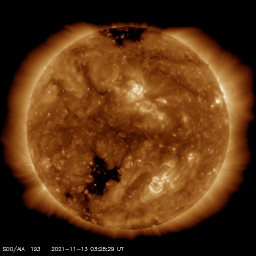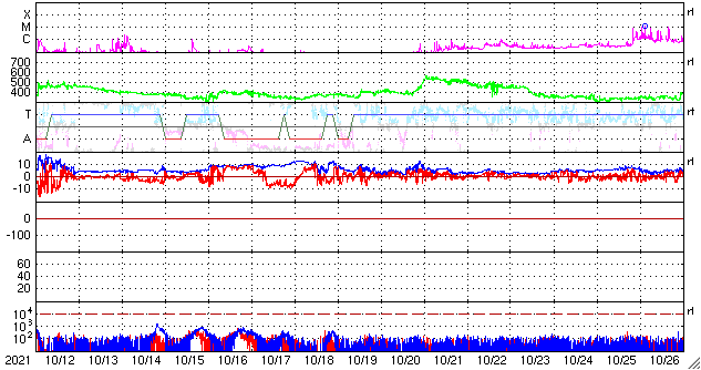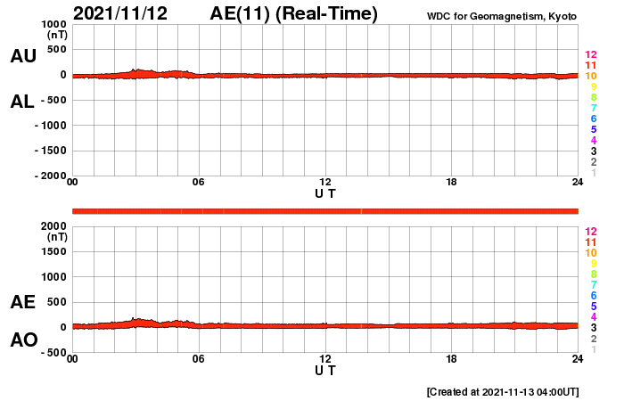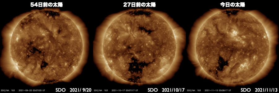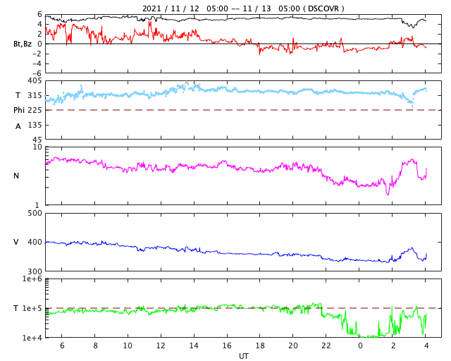 2021/11/13 13:16 更新 太陽風は低速になり、磁気圏も穏やかな状態です。 担当 篠原 太陽風の速度は400lkm/秒台を割り、 340km/秒と低速になっています。 磁場強度は、5nTと平均的な状態で安定しています。 磁場の南北成分は、0nT付近で小さく変化しています。 磁気圏は静穏で、AE指数は変化のない状態です。 SDO衛星AIA193では、 南半球のコロナホールが太陽の中心線に近付いています。 この領域を前の周期と比べると、 位置が少し左に動き、広さは小さくなっています。 現在のコロナホールの位置から考えると、 速度の高まりは4日後の17日くらいになりそうです。 一方、前周期の高速風はは少し遅れ気味に到来したのですが、 今回はどうなるでしょうか。 また、最高速度は前回の530km/秒に対して、 今回は少し下がるかもしれません。 注目してください。 太陽は、2893黒点群が西に沈み、 中心部の2895群は小さくなっています。 一方、2894群の右上に小さい黒点が現れています。 太陽の活動は穏やかで、 2894群でB6.5の小さいフレアが発生した程度です。
