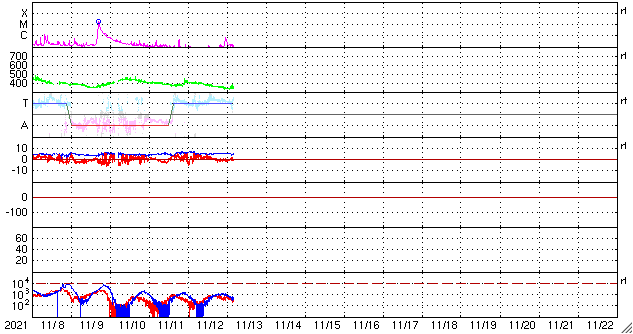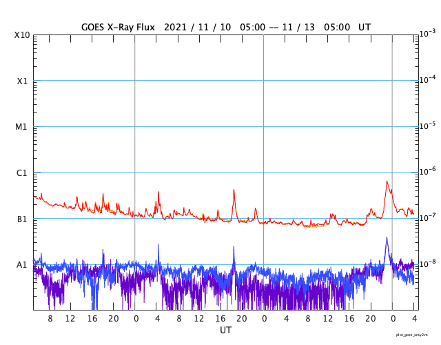 GOES衛星の太陽X線強度。赤・橙 = 0.1〜0.8 nm、青・紫 = 0.05〜0.4 nm (c) データ:NOAA/SWPC、作図:宇宙天気ニュース ![]() | ||||||||||||||||||||||||||||||||||||||||||||||||||||||||||||||||||||||||||||||||||||||||||||||||||||||||||||||||||||||||||||||||||||||||||||||||||||||||||||||||||||||||||||||||||||||||||||||||||||||||||||||||||||