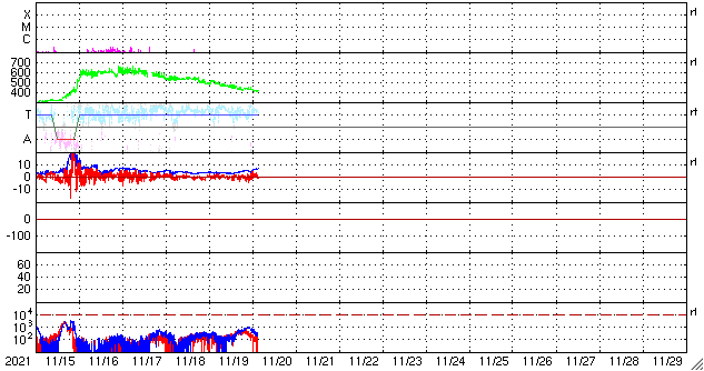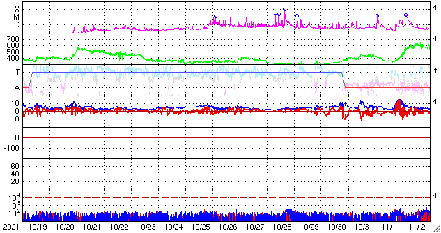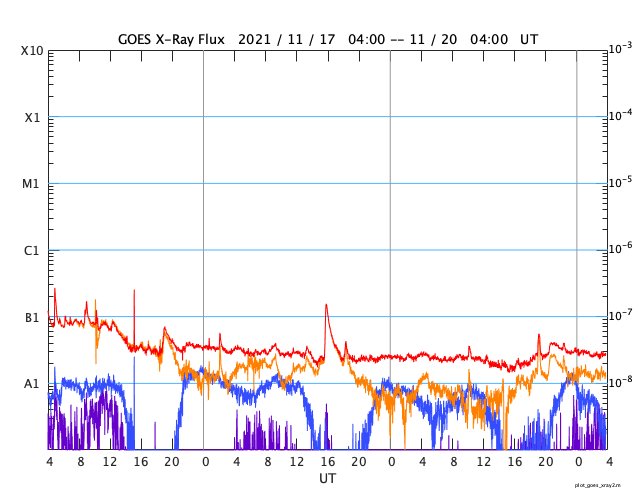 GOES衛星の太陽X線強度。赤・橙 = 0.1〜0.8 nm、青・紫 = 0.05〜0.4 nm (c) データ:NOAA/SWPC、作図:宇宙天気ニュース ![]() | ||||||||||||||||||||||||||||||||||||||||||||||||||||||||||||||||||||||||||||||||||||||||||||||||||||||||||||||||||||||||||||||||||||||||||||||||||||||||||||||||||||||||||||||||||||||||||||||||||||||||||||||
