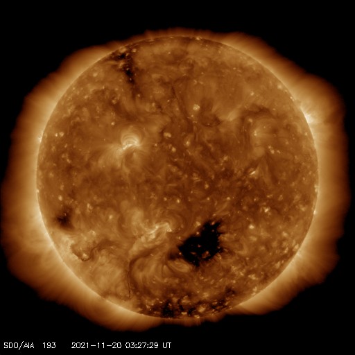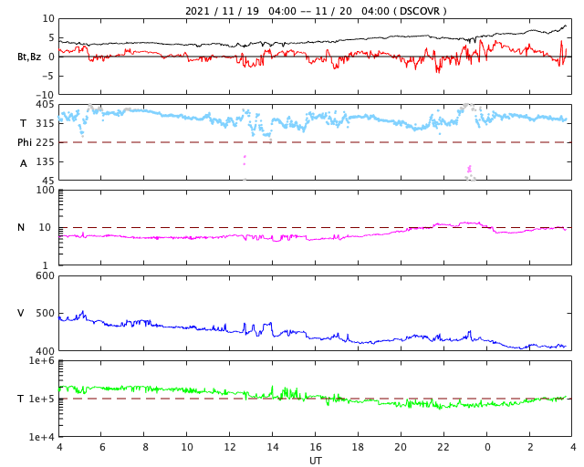2021/11/20 12:58 更新 太陽風の速度は平均的な状態に戻っています。磁気圏も穏やかです。 担当 篠原 太陽風の速度は低下が続き、 現在は410km/秒と平均的な状態に戻っています。 3nTに下がっていた磁場強度は、 今日に入る頃から少しずつ強まり、 グラフの最後は8nTとやや強い状態です。 次の高速風の到来が近付いているのでしょうか。 磁気圏は穏やかです。 AE指数は、時々、小さい変化が起きている程度です。 SDO衛星AIA193では、 南半球のコロナホールは西に進んでいます。 明日くらいから太陽風の速度が高まるかもしれません。 注目してください。 太陽は、2896、2897黒点群が見えていますが、 どちらも穏やかで、 X線グラフは全体の強度も下がっています。 Aクラスの下の方まで下がるのは、 1か月前の10月19日以来です。 ![]() SDO衛星のAIA193カメラによる太陽コロナの様子 (c) SDO (NASA) ![]() SDO衛星による太陽の可視光写真。マウスの矢印を写真に重ねると、黒点番号付きの写真に切り替わります。 (c) SDO (NASA) ![]() DSCOVRが観測した太陽風の磁場(黒線は全体の強度、赤線は南北成分) 磁場の向き、プラズマの密度、速度、温度 (c) データ:NOAA/SWPC、作図:宇宙天気ニュース ![]() AE指数(速報値) 下段のAEグラフの値が高くなると、オーロラ活動が活発化しています。 (c) 京都大学WDC ![]() ![]() 27日の太陽周期に合わせたデータプロット 太陽が同じ面を地球に向けていた27日前の変化から、今後を予想することができます。 (c) 作図:宇宙天気ニュース