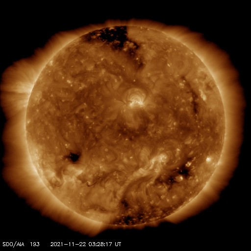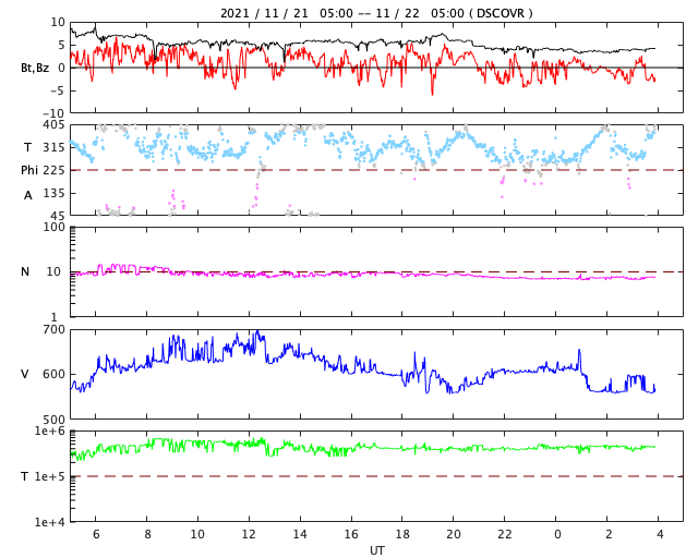 2021/11/22 13:09 更新 高速の太陽風が続いていますが、速度は低下に向かいそうです。 担当 篠原 昨日のニュースの後、 太陽風の速度は再び600km/秒台に高まり、 夜には650km/秒に達しました。 その後少し下がりましたが、 現在も560〜600km/秒と高速の状態が続いています。 太陽風の磁場強度は、5nTから3nTへ下がり、 やや弱くなっています。 太陽風速度の高まりは、ピークを越えた様です。 磁場の南北成分は、 北寄りから0nT付近へ傾向が変わっています。 弱い南向きの変化が見られる様になり、 AE指数は500nT程度の変化が続いています。 磁気圏はある程度活動的になっている様です。 SDO衛星AIA193では、 今回の高速風をもたらしたコロナホールは 南西(右下)に進んでいます。 この後、影響は弱まりそうです。 一方、北極から縦に伸びるコロナホールと、 南東(左下)に小さいコロナホールが見えています。 どちらも27日前には見えていなかったので、 今後、影響が現れるかどうか注目してください。 太陽は、2896群、2897群の黒点が小さく見えるだけです。 X線グラフは特に変化はありません。