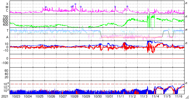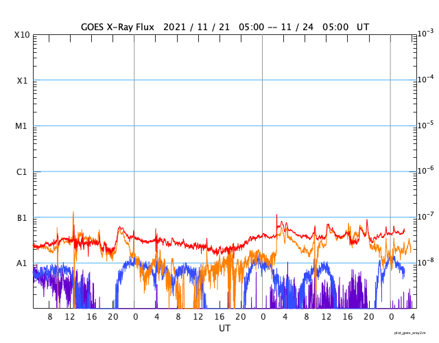 GOES衛星の太陽X線強度。赤・橙 = 0.1〜0.8 nm、青・紫 = 0.05〜0.4 nm (c) データ:NOAA/SWPC、作図:宇宙天気ニュース ![]() | ||||||||||||||||||||||||||||||||||||||||||||||||||||||||||||||||||||||||||||||||||||||||||||||||||||||||||||||||||||||||||||||||||||||||||||||||||||||||||||||||||||||||||||||||||||||||||||||||||||||||||||||||||||