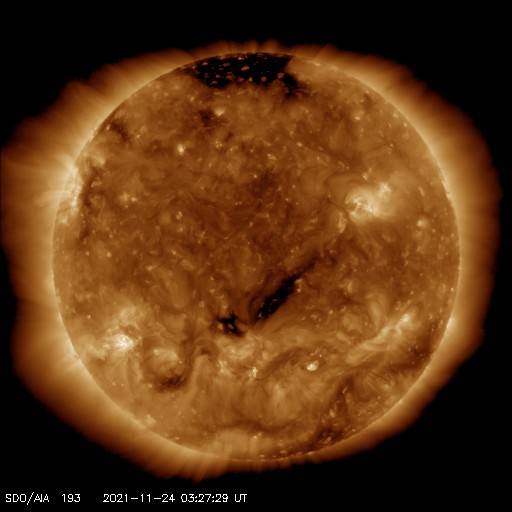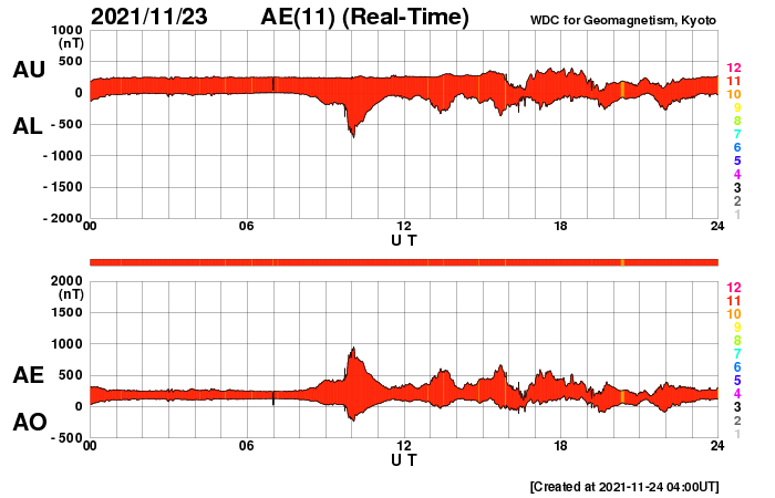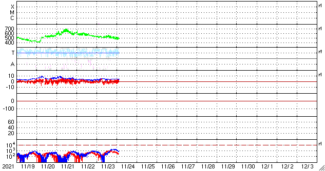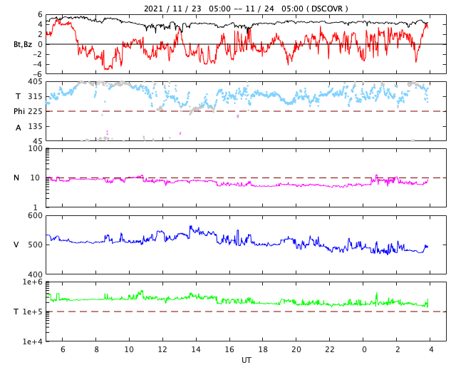 2021/11/24 13:05 更新 太陽風の速度はゆっくりと下がっています。新しい黒点が現れています。 担当 篠原 太陽風の速度はゆっくりと下がって、 現在は480km/秒とやや高速の状態です。 磁場強度は、4nTと平均的な状態で安定しています。 磁場の南北成分は、小幅で南北に変化しています。 AE指数は300〜500nTの小規模の変化が 半日ほど続いています。 (AEのグラフは全体が少し上にずれているので、 変化は少し小さく見積もる方が良いように思います) SDO衛星AIA193の南西(右下)に見えていた コロナホールの影響は、この辺りで終わりを迎えそうです。 続いて、太陽の中心部に見えるコロナホールの影響が 明後日くらいにやって来るかもしれません。 太陽は、南半球の中心付近に 2898黒点群が現れています。 SDO衛星の写真を拡大すると、 2898群の右にも小さい黒点が現れています。 また、昨日、南東(左下)に小さく見えていた黒点が、 現在の写真では2898群よりも目立つ大きさに発達しています。 X線グラフは、Aクラスの小さい変化が起きている程度で、 活動は穏やかです。