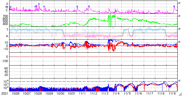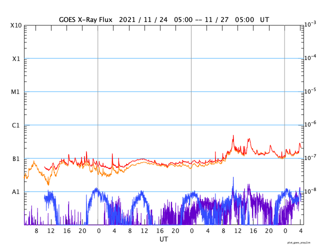 GOES衛星の太陽X線強度。赤・橙 = 0.1〜0.8 nm、青・紫 = 0.05〜0.4 nm (c) データ:NOAA/SWPC、作図:宇宙天気ニュース ![]() | ||||||||||||||||||||||||||||||||||||||||||||||||||||||||||||||||||||||||||||||||||||||||||||||||||||||||||||||||||||||||||||||||||||||||||||||||||||||||||||||||||||||||||||||||||||||||||||||||||||||||||||||||||||
