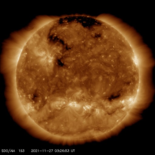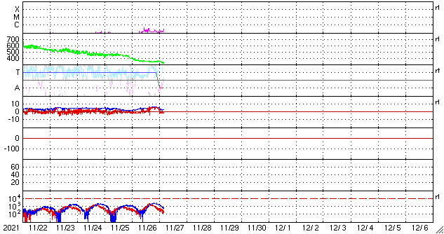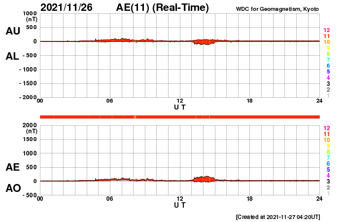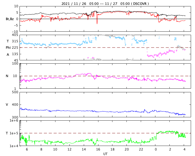 2021/11/27 13:24 更新 太陽風は更に低速になっています。新しい黒点が現れています。 担当 篠原 太陽風は、350km/秒と低速の状態が続き、 グラフの最後で320km/秒へ更に下がっています。 磁場強度は、3nTからグラフの中盤で6nTに上がりましたが、 その後3nTに戻っています。 やや弱い状態です。 磁気圏は静穏で、AE指数はほとんど変化がありません。 SDO衛星AIA193では、 北東(左上)の縦に伸びるコロナホールが 太陽の中心線に近付いています。 広がりは小さいので、影響も弱いかもしれません。 太陽では、昨日南西(右下)に見えていた黒点に 2899群と番号が付けられています。 その左にも小さい黒点が見えています。 また、2898群の右に新しい黒点が現れて、 2900群となっています。 ここでBクラスの小さいフレアが続いていて、 X線グラフが少し高まっています。 この後の変化に注目してください。