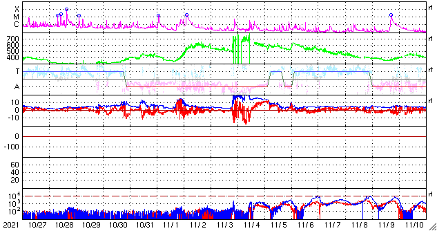 GOES衛星の太陽X線強度。赤・橙 = 0.1〜0.8 nm、青・紫 = 0.05〜0.4 nm (c) データ:NOAA/SWPC、作図:宇宙天気ニュース ![]() | ||||||||||||||||||||||||||||||||||||||||||||||||||||||||||||||||||||||||||||||||||||||||||||||||||||||||||||||||||||||||||||||||||||||||||||||||||||||||||||||||||||||||||||||||||||||||||||||||||||||||||||||||||||