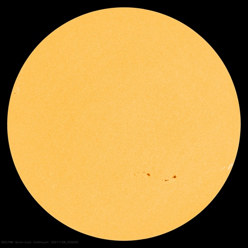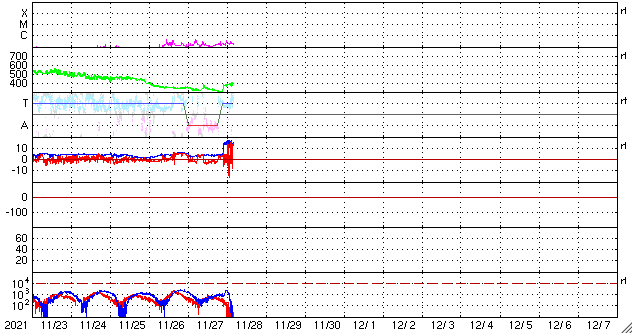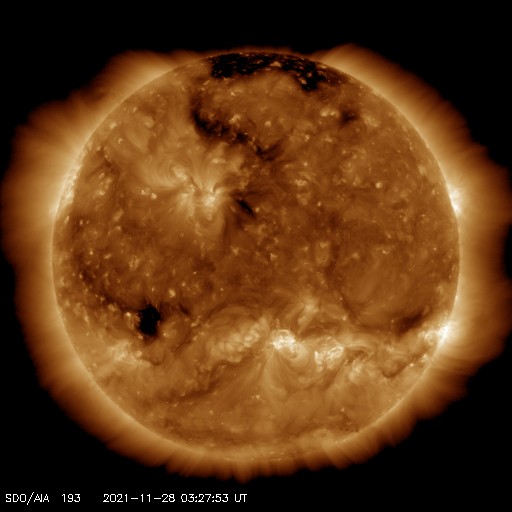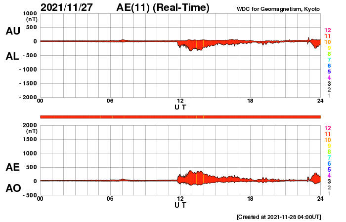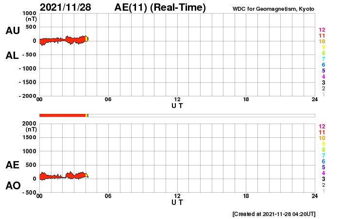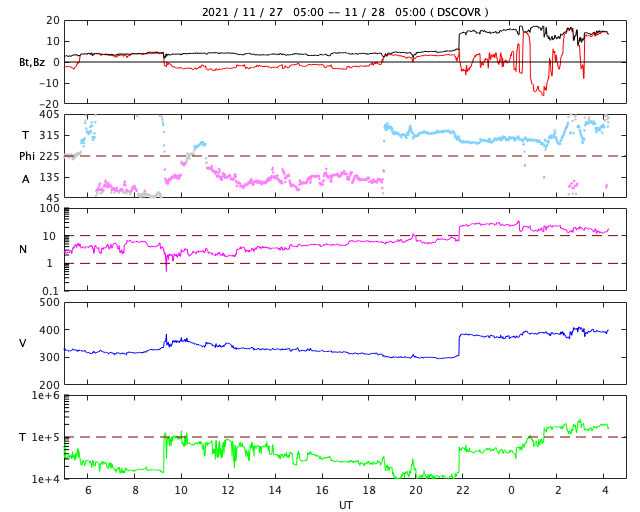 2021/11/28 13:23 更新 太陽風の小規模の乱れが到来しています。太陽風はやや低速です。 担当 篠原 今朝、28日7時(世界時27日22時)に、 太陽風の急な強まりがDSCOVR衛星で観測されています。 速度は300km/秒から380km/秒と、 低速からやや低速に高まったくらいですが、 磁場強度は、5nTから15nTと比較的大きい変化になっています。 25日のニュースでお知らせした、 24日に発生したフィラメント噴出による乱れだと思われます。 発生から3日半ほどで地球へ到来しています。 強まりが到来して3時間後くらいに、 磁場の南北成分が -15nTと大きく南向きに変化しています。 この影響で磁気圏の活動が一時的に高まりそうですが、 AE指数は今のところ小さい変化に留まっています。 その後は磁場は北向きに切り替わっていて、 磁気圏の乱れは、発生しても短い時間で終わりそうです。 SDO衛星AIA193は、中心部の北側に縦に程長いコロナホールが、 東側の南半球に横に細長いコロナホールがそれぞれ見えています。 広がりが小さいので、地球への影響はどうなるでしょうか。 太陽は、2900黒点群が2898群よりも大きくなっています。 また、北東の端(左上)に新しい黒点が現れています。 X線グラフは、Bクラスの小さい変化が見られるだけで、 落ち着いた状態です。