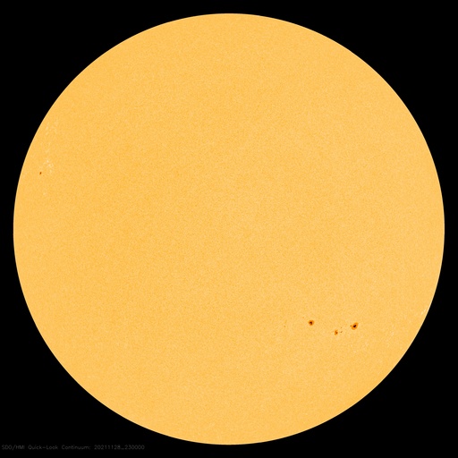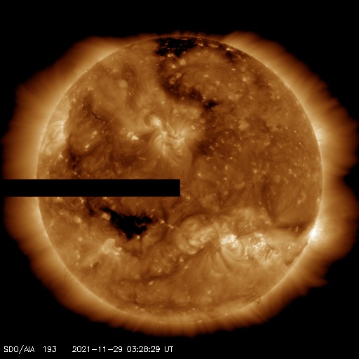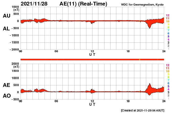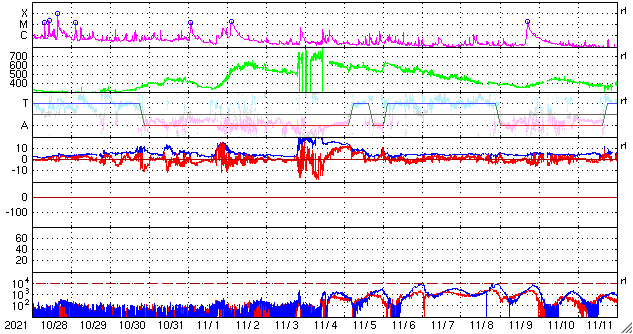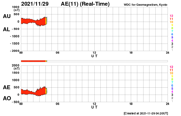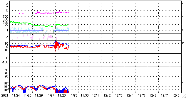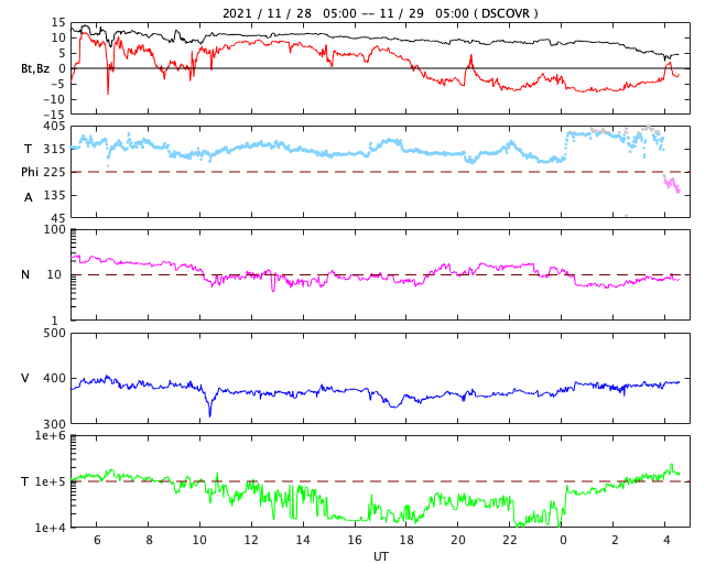 2021/11/29 13:47 更新 磁場の強まりは終わり、太陽風は平均的な状態です。 担当 篠原 太陽風の磁場強度は、 今朝まで9nTと強まった状態が続きました。 その後は下がって、現在は4nTと平均的な状態です。 太陽風の速度は、390km/秒から360km/秒へ少し下がり、 再び390km/秒に戻っています。 現在は平均的な状態です。 太陽風磁場の南北成分は、 グラフの後半は-5nT程度の南向きが続いています。 このため、磁気圏の活動はやや高まって、 AE指数は500nTに達する程度の 小規模の変化が発生しています。 太陽風のグラフの最後で、 南北成分は0nT付近に戻っているので、 この後の磁気圏は穏やかになりそうです。 太陽は、南西(右下)の2890黒点群で Bクラスの小さいフレアが続いています。 黒点の大きさに特に変化はありません。
