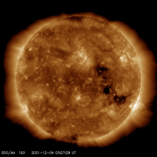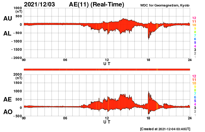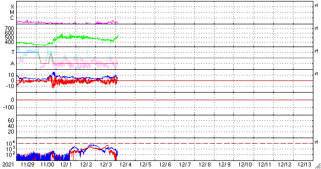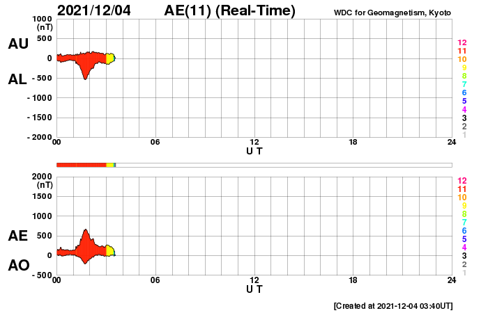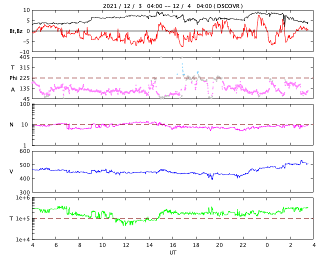 2021/12/ 4 12:46 更新 太陽風の速度は510km/秒に高まっています。 担当 篠原 太陽風の速度は、 460km/秒から430km/秒へゆっくりと下がっていましたが、 今朝以降は上昇に切り替わり、 現在は510km/秒と高速の状態に戻っています。 SDO衛星AIA193で 太陽の西側に進んでいたコロナホールの影響が始まった様です。 太陽風の磁場強度は、 昨夜から8nTくらいに強まる変化が発生しています。 現在は少し下がって、5nTと平均的な状態です。 磁場の南北成分は、 -5nT程度の南向きの変化が度々発生しています。 このため磁気圏の活動も高まっていて、 AE指数は500〜1000nTの中規模の変化が続いています。 SDO衛星AIA193では、 中心部のコロナホールは全体が西半球に進み、 東側(左側)にコロナホールはありません。 太陽風の高まりはこれから3〜4日程度続き、 その後は速度が下がって穏やかになりそうです。 太陽は、南西の端(右下)に活動的な領域が発生して、 Bクラスの小さいフレアが続いています。 その他は小さい黒点が見られる程度で、 南西の領域が沈んだ後は、太陽は静かになりそうです。
