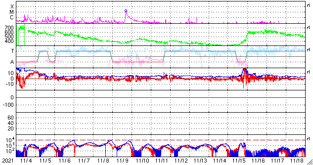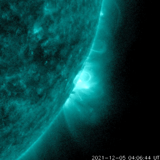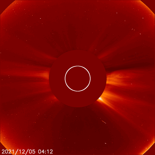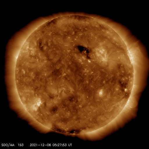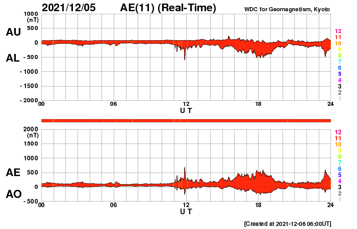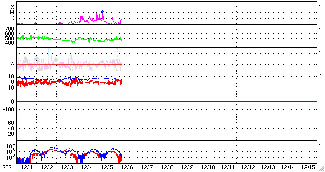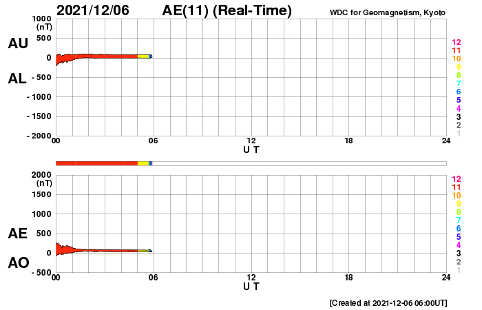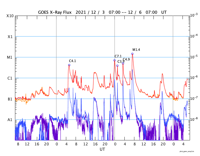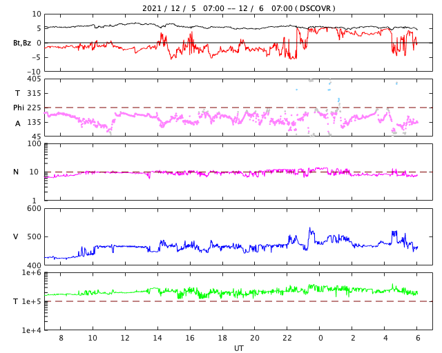 2021/12/ 6 15:11 更新 太陽の南西端の向こう側でフレアが続きました。太陽風はやや高速です。 担当 篠原 昨日のニュースの後も太陽の南西端でフレアの発生は続き、 5日16時(世界時5日7時)に、 M1.4の中規模フレアが発生しました。 Mクラスのフレアの発生は、11月9日のM2.0以来、 およそ1か月ぶりです。 SDO衛星AIA131による動画を掲載します。 太陽の端の向こう側で発生しているので、 本当の規模はこれよりも大きかった可能性があります。 そして、今朝、6日4時(世界時5日19時)には、 C1.6の小規模フレアが発生しています。 この2つのフレアに伴って、 CME(コロナ質量放出)が発生しています。 SOHO衛星LASCO C2の動画を見ると、 後のC1.6フレアの方がより激しい噴出になっています。 フレアの規模も こちらの方がより大きかったのかもしれません。 現在の太陽面は、 南東側(左下)に2904黒点群が見えるだけです。 太陽風は、昨夜から速度が少し高まり、 現在は480km/秒とやや高速の状態です。 コロナホールの影響が続いている様です。 SDO衛星AIA193の太陽コロナ写真は、 中心部の北側に小さいコロナホールが見える程度です。 現在の速度の高まりが終わった後は、 しばらく穏やかな太陽風が続きそうです。 ![]() 太陽の南西端で発生したM1.4の中規模フレア。SDO衛星AIA131。 (c) SDO (NASA)、(動画加工 : 宇宙天気ニュース) ![]() M1.4とC1.6フレアによるCME。SOHO衛星LASCO C2。 (c) SOHO (ESA & NASA)、 (動画加工 : 宇宙天気ニュース) ![]() SDO衛星のAIA193カメラによる太陽コロナの様子 (c) SDO (NASA) ![]() SDO衛星による太陽の可視光写真。マウスの矢印を写真に重ねると、黒点番号付きの写真に切り替わります。 (c) SDO (NASA) ![]() GOES衛星の太陽X線強度。赤・橙 = 0.1〜0.8 nm、青・紫 = 0.05〜0.4 nm (c) データ:NOAA/SWPC、作図:宇宙天気ニュース ![]() DSCOVRが観測した太陽風の磁場(黒線は全体の強度、赤線は南北成分) 磁場の向き、プラズマの密度、速度、温度 (c) データ:NOAA/SWPC、作図:宇宙天気ニュース ![]() AE指数(速報値) 下段のAEグラフの値が高くなると、オーロラ活動が活発化しています。 (c) 京都大学WDC ![]() ![]() 27日の太陽周期に合わせたデータプロット 太陽が同じ面を地球に向けていた27日前の変化から、今後を予想することができます。 (c) 作図:宇宙天気ニュース