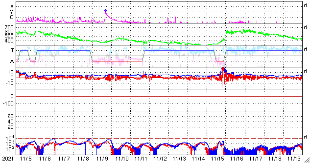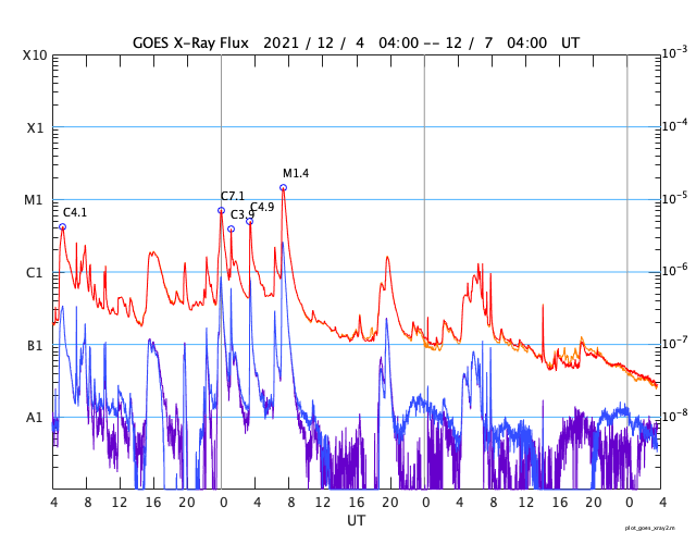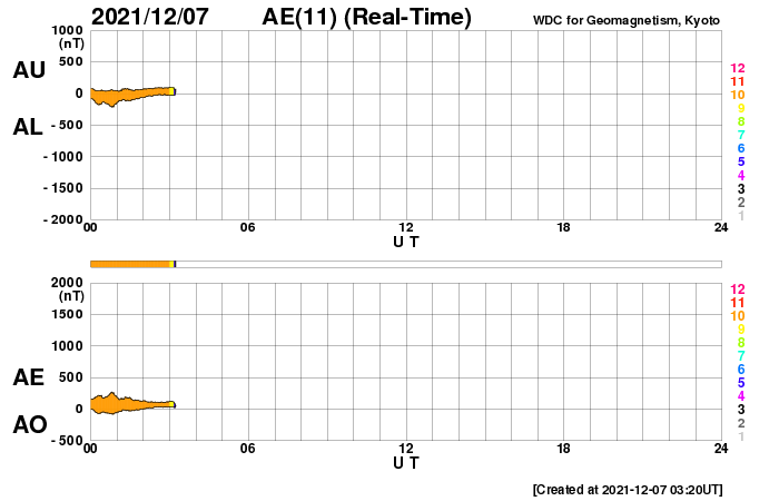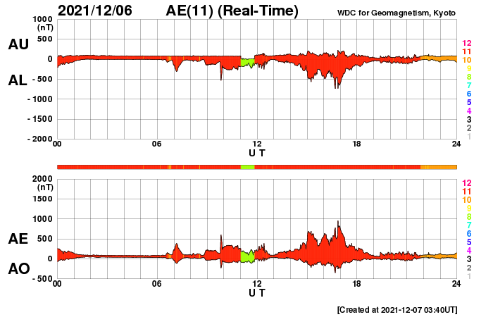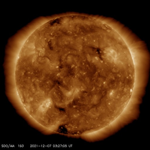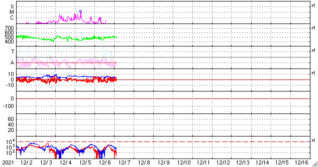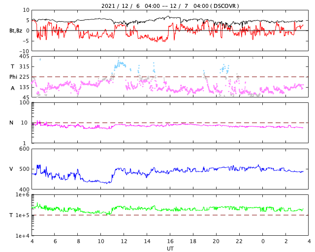 2021/12/ 7 12:50 更新 太陽は穏やかになっています。太陽風は高速の状態です。 担当 篠原 太陽は、昨日のニュースの直後に発生した 2回のC1の小規模フレアを最後に、 X線グラフに変化は見られなくなっています。 黒点は、南東(左下)に2904群が見えるだけです。 太陽風は、昨日の夕方に速度が430km/秒へ下がりましたが、 その後再び高まって、 480〜500km/秒と高速の状態が続いています。 磁場強度は5nTと平均的な状態で、 グラフの前半で南北成分が南寄りになり、 AE指数は500〜800nTの中規模の変化が発生しています。 その後、南北成分は0nT付近で小さく変化する様になり、 AE指数の変化も見られなくなっています。 SDO衛星AIA193では、 目立つ広がりのコロナホールはありません。 この後、太陽風は穏やかな風になりそうです。