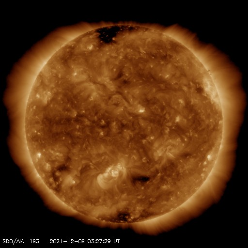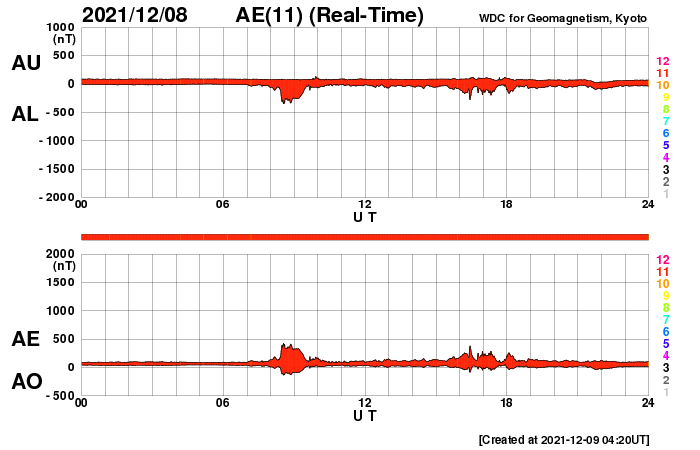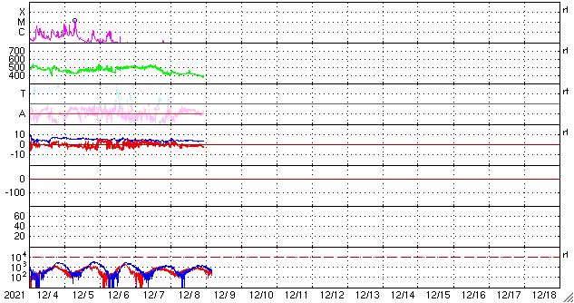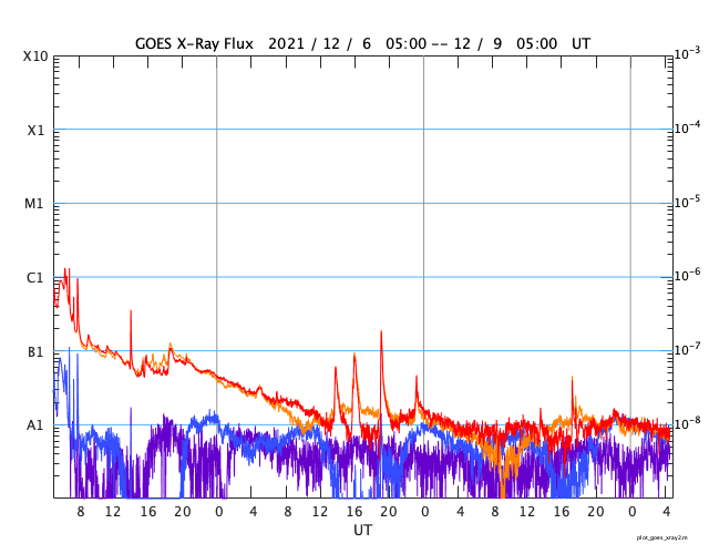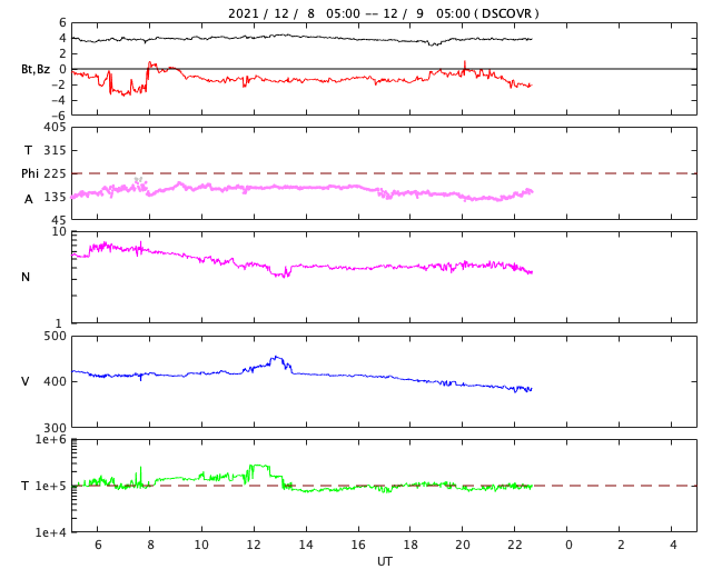 2021/12/ 9 13:41 更新 太陽は無黒点になっています。太陽風は平均的な状態です。 担当 篠原 太陽は、2904黒点群が消えて、 無黒点になっています。 WDC-SILSOの黒点相対数の記録によると、 10月17日以来、およそ2か月ぶりとなるかもしれません。 (今日の記録が0になるかどうかは、まだ分かりません) また、X線グラフは、 全体の強度がA1のレベルまで下がっています。 ここまで下がるのは、 4月以来、8か月ぶりとなる様です。 太陽はとても穏やかです。 太陽風は、図の途中までしかデータがありませんが、 速度は390km/秒と少し下がっています。 磁場強度は4nTと平均的な状態です。 磁気圏は穏やかで、 AE指数は小さい変化が数回見られる程度です。 SDO衛星AIA193の太陽コロナ写真では、 中心部にコロナホールはありませんが、 南東(左下)からコロナホールの広がりが見え始めている様です。