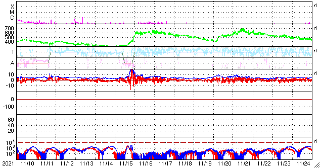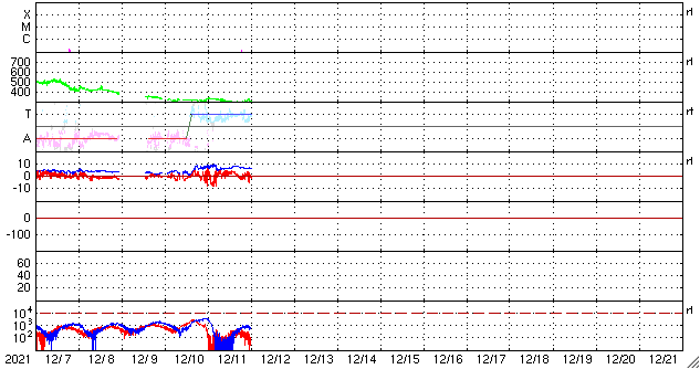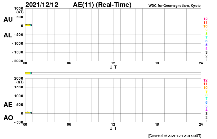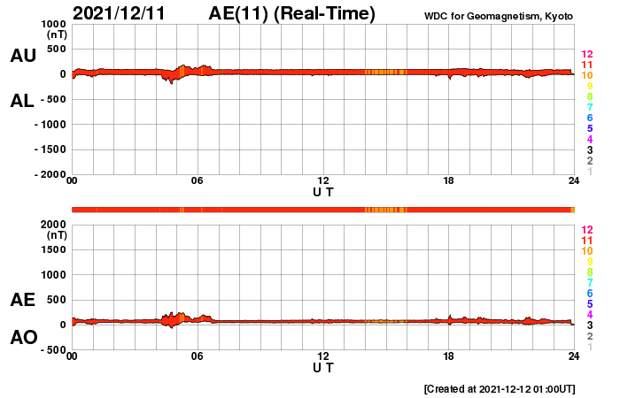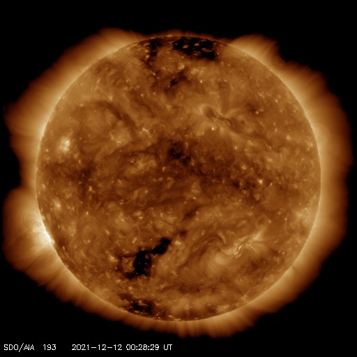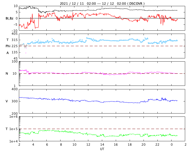 2021/12/12 10:08 更新 太陽風は低速で、磁気圏も穏やかです。 担当 篠原 太陽風は、300km/秒前後の低速の風が続いています。 磁場強度は、8nTから6nTに少しずつ下がり、 平均的な状態です。 磁場の南北成分は、 グラフの最初に南向きの変化が強まっていますが、 以降は、北寄りか0nT付近と小さくなっています。 磁気圏は静穏で、AE指数はほとんど変化のない状態です。 SDO衛星AIA193では、 南半球のコロナホールが太陽の中心線に達しています。 3日後の15日くらいから 太陽風速度が高まる可能性があります。 コロナホールの進み方は、 前周期と比べると2日ほど遅くなっているので、 太陽風の変化も同じように 2日くらい遅れて始まるかもしれません。 SDO衛星の可視光写真によると、 太陽の南東側(左下)に小さい黒点が現れている様です。 掲載の写真では小さすぎて見つけられません。 はっきり分かる大きさに成長するでしょうか。 SDO衛星の画像では、 南東の端(左下)から活動的な領域が近づいていて、 この後、こちら側に姿を現しそうです。