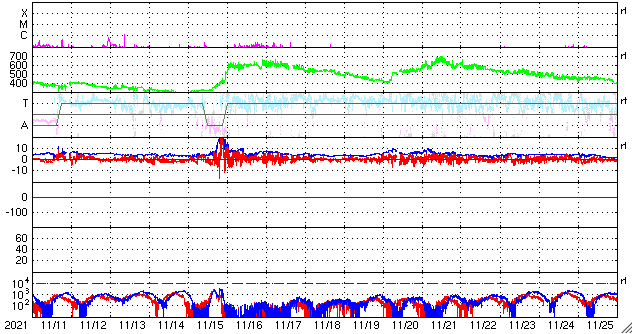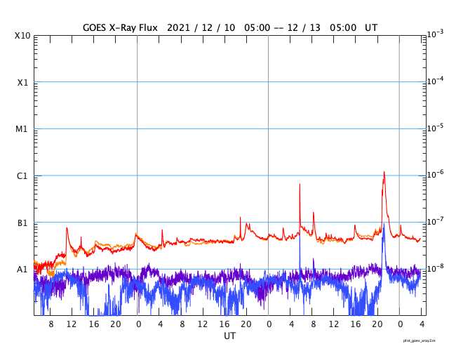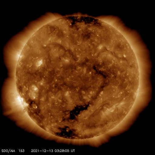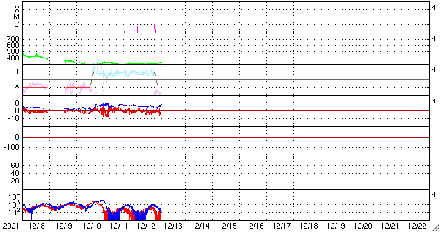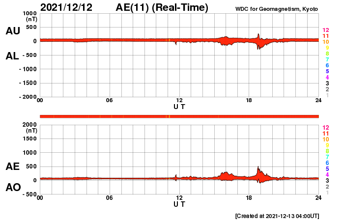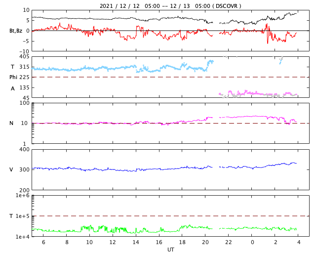 2021/12/13 13:09 更新 黒点が増えています。太陽風は低速の状態です。 担当 篠原 太陽の南東(左下)に現れていた黒点に、 2905群と番号が付けられています。 また、北東側(左上)に新しい黒点が出現し、 南東の端(左下)の活動的な領域にも小さい黒点が見えています。 この領域で、今朝、13日6時(世界時12日21時)に C1.2の小規模フレアが発生しました。 今後の活動はどうなるでしょうか。 太陽風は、300km/秒と低速の風が続いていましたが、 グラフの最後で330km/秒へ少し上がっています。 磁場強度も、このタイミングで5nTから8nTへ少し上がっていて、 この変化が続くのかどうか、引き続き注目してください。 SDO衛星AI193では、 南半球のコロナホールが西側に進んでいます。 位置としては、影響の始まりはもう少し先だと思いますが、 どうでしょうか。 AE指数は、一時的に小規模の変化が発生していますが、 全体としては静かな状態です。