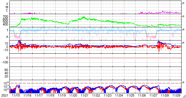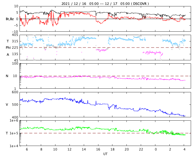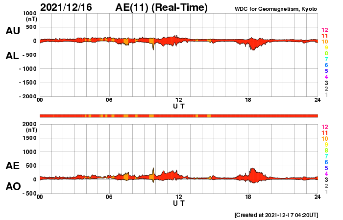 (c) SDO (NASA)、作図:宇宙天気ニュース ![]() SDO衛星のAIA193カメラによる太陽コロナの様子 (c) SDO (NASA) ![]() SDO衛星による太陽の可視光写真。マウスの矢印を写真に重ねると、黒点番号付きの写真に切り替わります。 (c) SDO (NASA) ![]() GOES衛星の太陽X線強度。赤・橙 = 0.1〜0.8 nm、青・紫 = 0.05〜0.4 nm (c) データ:NOAA/SWPC、作図:宇宙天気ニュース ![]() DSCOVRが観測した太陽風の磁場(黒線は全体の強度、赤線は南北成分) 磁場の向き、プラズマの密度、速度、温度 (c) データ:NOAA/SWPC、作図:宇宙天気ニュース ![]() AE指数(速報値) 下段のAEグラフの値が高くなると、オーロラ活動が活発化しています。 (c) 京都大学WDC ![]() ![]() 27日の太陽周期に合わせたデータプロット 太陽が同じ面を地球に向けていた27日前の変化から、今後を予想することができます。 (c) 作図:宇宙天気ニュース