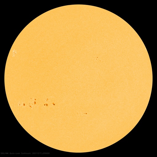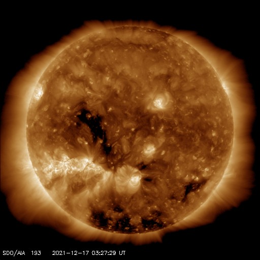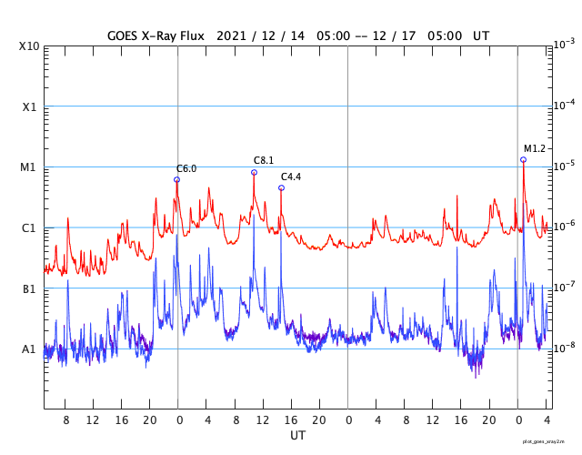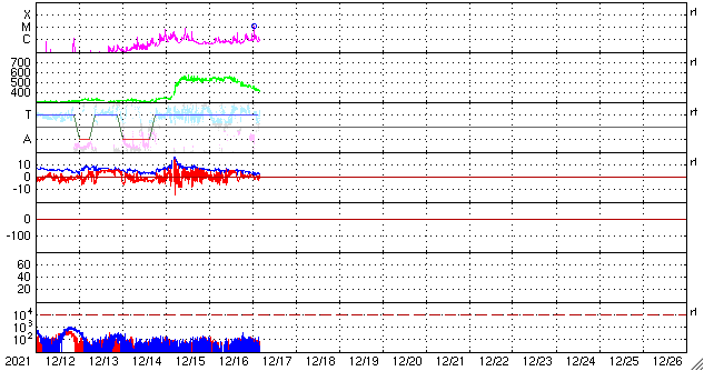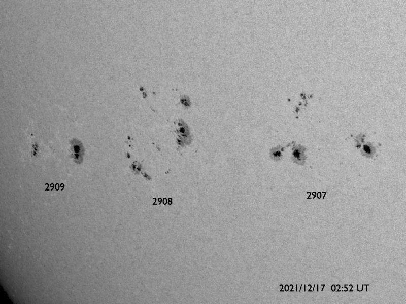2021/12/17 13:23 更新 M1.2の中規模フレアが発生しました。太陽風は平均的な速度に戻っています。 担当 篠原 太陽の北東(左上)に現れた活動的な領域に黒点が発生して、 2911群と番号が付けられています。 この領域で、今朝、17日9時半(世界時17日0時半)に、 M1.2の中規模フレアが発生しました。 一方、南東(左下)の黒点では、 2907群でC1.5、2909群でC3.3、C3.0などの 小規模フレアが発生しています。 南東側の黒点の可視光写真を掲載します。 太陽の中に進んできたため、 3つの黒点群の横の広がりが大きく見える様になっています。 全体が入るように写真の倍率を調節しているので、 昨日の写真との比較では注意して下さい。 STEREO Ahead衛星の観測によると、 太陽の東端の向こう側には別の活動的な領域があり、 今後、こちら側に姿を現しそうです。 どの様な領域が現れるか注目してください。 太陽風は、昨夜遅くから速度が下がり始め、 550km/秒と高速だった太陽風は、 現在は400km/秒と平均的な速度に戻っています。 磁場強度も5nTから3nTへ下がり、やや弱くなっています。 27日周期の図を見ると、 太陽風速度の高まりは、1日半ほどで終わっています。 AE指数は、グラフの途中までは小規模の変化が続いていますが、 最後のところは変化がなくなり、静かになっています。 SDO衛星AIA193では、 太陽の中心部の東側にコロナホールが見えています。 4日後くらいからこの領域の影響で太陽風の速度が高まりそうです。