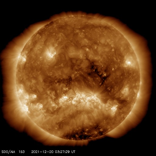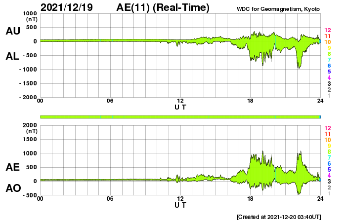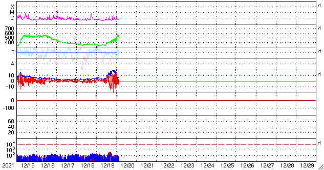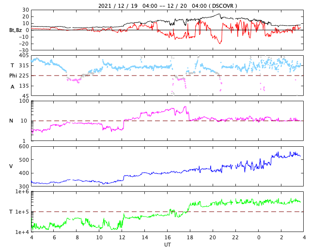 2021/12/20 12:55 更新 高速太陽風が到来しています。 Cクラスフレアが続いています。 担当 篠原 昨夜から太陽風の速度が上昇を始め、 330km/秒の低速風から、 現在は550km/秒の高速風に変わっています。 太陽風の磁場強度も同様に強まり始め、 今朝早くに24nTに達しました。 その後は下がっていますが、 現在も7nTとやや強まった状態です。 SDO衛星AIA193の太陽の中心部に見えていた コロナホールの影響が到来した可能性があります。 今日の写真では、やや見にくくなっていますが、 コロナホールは太陽の中心線を通り過ぎようとしています。 これから5日くらい太陽風速度の高まりは続くかもしれません。 太陽風磁場の南北成分は、 磁場が強まっていた頃に南向きに大きく変化しています。 このため、磁気圏の活動も高まって、 AE指数は1000nTに達する大きな変化が2回発生しています。 磁場がピークに達した後は、 南向きの変化は少なくなり、 AE指数の変化も小規模になっています。 現在は太陽風の速度が高まっているので、 磁場が南向きに変化すると、 オーロラの活動も高まることが期待できます。 太陽は、中心部の南側にある2907、2908、2909黒点群で、 C1.5、C1.8、C1.8、C3.7、C1.6、C4.4と 小規模フレアが続いています。 黒点もあちこちに見えていて、 にぎやかな太陽面です。 ![]() SDO衛星のAIA193カメラによる太陽コロナの様子 (c) SDO (NASA) ![]() SDO衛星による太陽の可視光写真。マウスの矢印を写真に重ねると、黒点番号付きの写真に切り替わります。 (c) SDO (NASA) ![]() DSCOVRが観測した太陽風の磁場(黒線は全体の強度、赤線は南北成分) 磁場の向き、プラズマの密度、速度、温度 (c) データ:NOAA/SWPC、作図:宇宙天気ニュース ![]() AE指数(速報値) 下段のAEグラフの値が高くなると、オーロラ活動が活発化しています。 (c) 京都大学WDC ![]() ![]() 27日の太陽周期に合わせたデータプロット 太陽が同じ面を地球に向けていた27日前の変化から、今後を予想することができます。 (c) 作図:宇宙天気ニュース