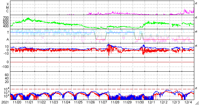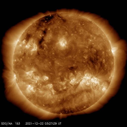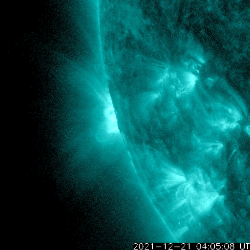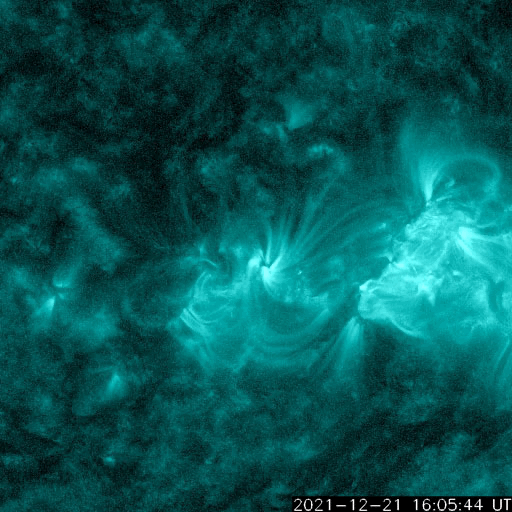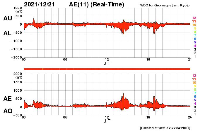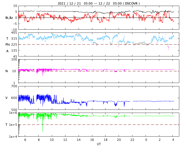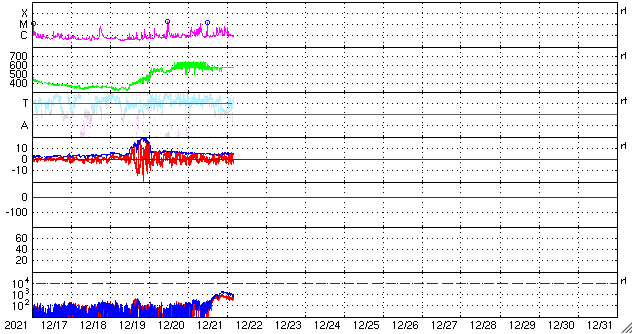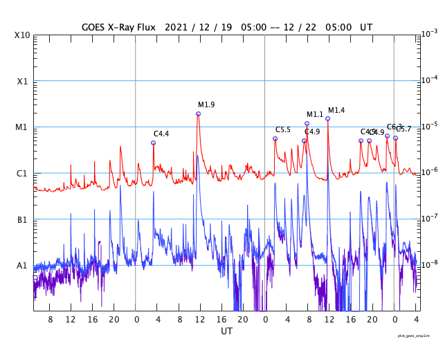 2021/12/22 13:24 更新 活発にフレアが発生しています。高速太陽風が続いています。 担当 篠原 太陽では、フレアが活発に続いています。 昨日のニュース以降、Mクラスの中規模フレアが2回、 Cクラスの小規模フレアが10回ほど発生しています。 Mフレアは、太陽の東端(左端)に新しく現れた 2916黒点群で発生しています。 21日16時半(世界時21日7時半)にM1.1、 21日20時半(世界時21日11時半)にM1.4と連続しています。 SDO衛星AIA131による動画を掲載します。 2916群は、この後もC3.9、C5.7の小規模フレアを起こしています。 今後の活動に注目して下さい。 また、太陽の中心付近の2909黒点群で、 今朝、22日4時(世界時21日19時)に、 C4.9の小規模フレアが発生しています。 SDO衛星AIA131、193の動画を2枚目に掲載していますが、 AIA193の画像では、コロナのガスが飛び出す様な変化が見えています。 このため、CME(コロナ質量放出)が発生している可能性があります。 太陽の中心線に近い位置なので、乱れは地球へ向かっている可能性が高く、 25日頃に太陽風の変化が到来するかもしれません。 昨日紹介したCMEとともに注目して下さい。 太陽風は、570km/秒と少し速度が下がっていますが、 依然、高速の状態が続いています。 磁場強度は5nTと平均的な値です。 磁場の南北成分は、0nT付近か比較的北寄りの傾向です。 磁気圏の活動は時々活発になる程度で、 AE指数は700nTの変化が2回発生していますが、 その前後は変化が小さい状態です。 SDO衛星AIA193では、コロナホールは西に過ぎています。 この後、高速風は終わりに向かいそうです。
