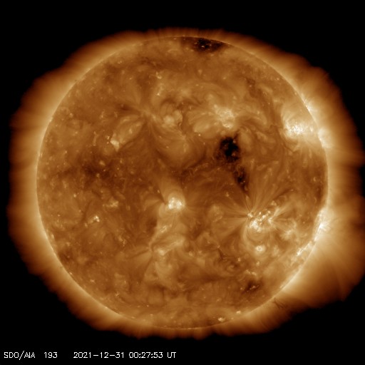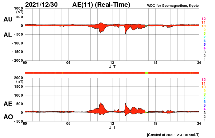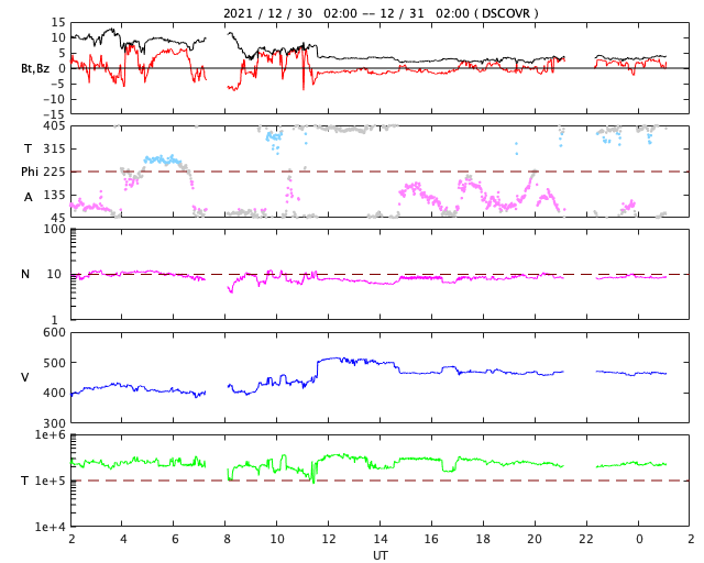 2021/12/31 10:17 更新 太陽風の速度は少し高まっています。太陽は黒点が少なくなっています。 担当 篠原 太陽風は、昨日のニュースの後に速度が400km/秒へ下がり、 夜になると再び上がって、460〜470km/秒で推移しています。 1つ前のコロナホールの影響が続いているのでしょうか。 10nTに強まっていた磁場強度は、夜には3nTに下がり、 以降、やや弱い状態で安定しています。 南北成分は、磁場が強まっていた頃に南向きに少し強まって、 AE指数で500nTの中規模の変化が発生していますが、 磁場が弱まった後は南北の変化も小さくなり、 磁気圏は穏やかになっています。 SDO衛星AIA193では、 太陽の中心部の西側(右側)にコロナホールが見えています。 明日以降は、この領域の影響で 太陽風の速度がやや高まるかもしれません。 一方、太陽の東側(左側)にはコロナホールは見られないので、 その後は穏やかな太陽風がしばらく続きそうです。 太陽は、北西(右上)の2921群と2918群で Bクラスの小さいフレアが続いています。 しかし、2921群は西の端に沈み、 2918群も次第に近づいていて、 この後の太陽は穏やかになりそうです。 今日の可視光写真は、 南西(右下)の2916群が目立っているだけで、 黒点の数がだいぶ少なくなっています。 2021年の更新はこれが最後となりそうです。 今年も1年間ありがとうございました。 どうぞよいお年をお迎えください。 ![]() SDO衛星のAIA193カメラによる太陽コロナの様子 (c) SDO (NASA) ![]() SDO衛星による太陽の可視光写真。マウスの矢印を写真に重ねると、黒点番号付きの写真に切り替わります。 (c) SDO (NASA) ![]() DSCOVRが観測した太陽風の磁場(黒線は全体の強度、赤線は南北成分) 磁場の向き、プラズマの密度、速度、温度 (c) データ:NOAA/SWPC、作図:宇宙天気ニュース ![]() AE指数(速報値) 下段のAEグラフの値が高くなると、オーロラ活動が活発化しています。 (c) 京都大学WDC ![]() ![]() 27日の太陽周期に合わせたデータプロット 太陽が同じ面を地球に向けていた27日前の変化から、今後を予想することができます。 (c) 作図:宇宙天気ニュース