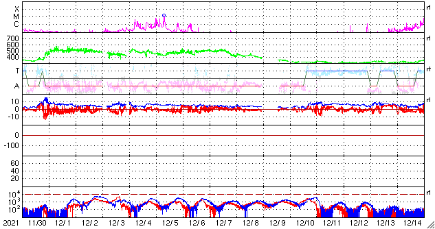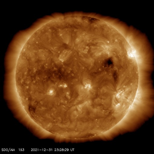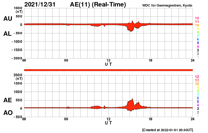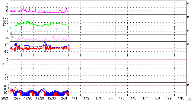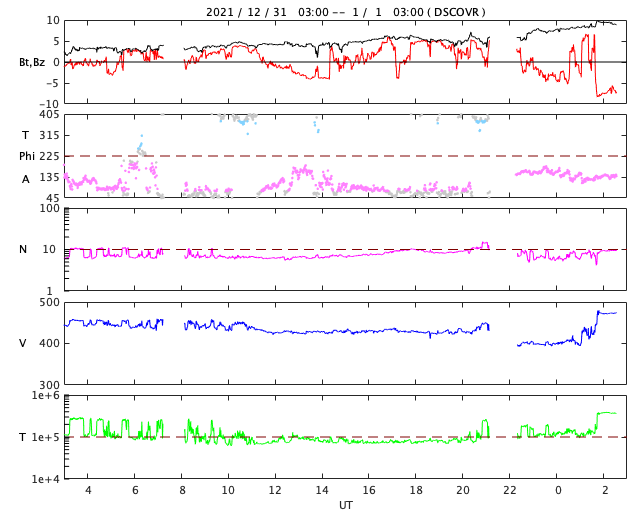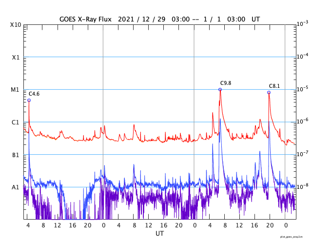 2022/ 1/ 1 11:41 更新 C9、C8の小規模フレアが発生しています。太陽風の速度が高まるかもしれません。 担当 篠原 明けましておめでとうございます。 2022年も宇宙天気ニュースをよろしくお願い致します。 太陽の北西(右上)の2918黒点群で、 昨日の午後、12月31日16時(世界時31日7時)にC9.8、 今朝、1月1日4時半(世界時31日19時半)にC8.1と、 大きめの小規模フレアが発生しました。 世界時ではどちらも31日ですが、 日本時間では2021年の最後と2022年の最初の 目立つ規模のフレアとなっています。 2918群は太陽の端に近づいていて、 この後、向こう側に沈んで行きます。 2918群が沈んだ後、太陽のフレア活動は穏やかになりそうです。 太陽風は、速度が450km/秒から400km/秒へ下がっています。 一方、磁場強度は3nTから9nTへ次第に強まっていて、 この後、太陽風速度の高まりが始まるかもしれません。 速度のグラフでは、最後に470km/秒へ上がる変化が見えていますが、 この後の推移に注目して下さい。 太陽風磁場の南北成分は、南北にゆっくりと変化しています。 このため、南向きになった頃に、 AE指数では500nTに達する中規模の変化が発生しています。 太陽風のグラフの最後の頃は磁場が南向きに変化しているので、 磁気圏の活動が高まる可能性があります。 新年の活発なオーロラ活動となるでしょうか。