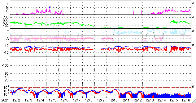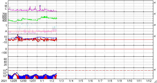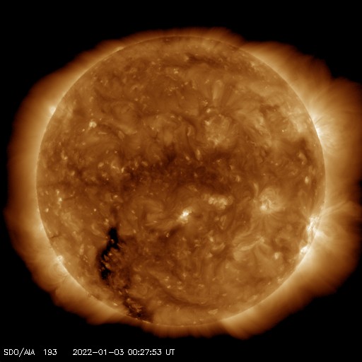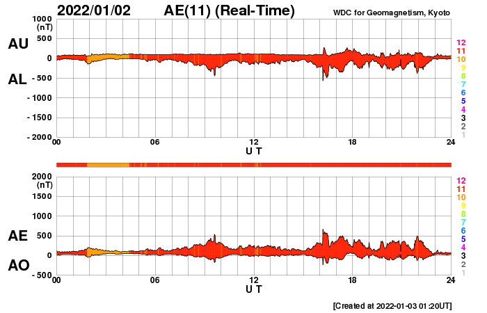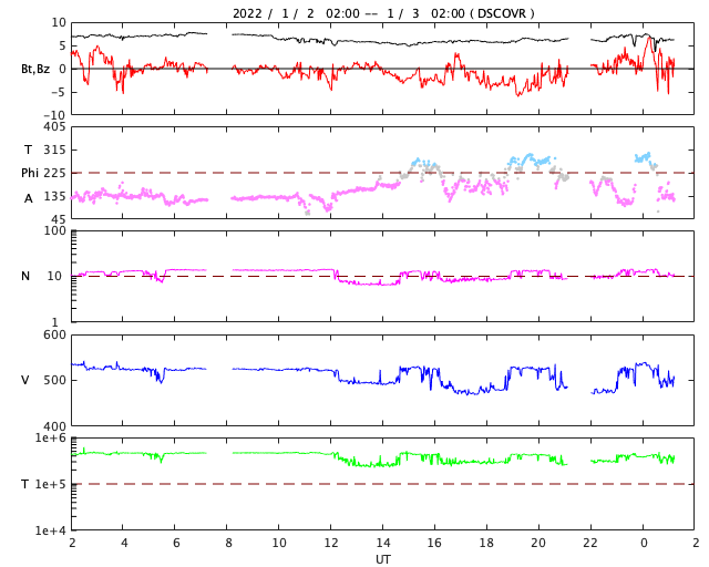 2022/ 1/ 3 10:22 更新 高速太陽風が続き、磁気圏はやや活動的です。 担当 篠原 540km/秒に高まっていた太陽風の速度は、 昨日のニュース以降は少しずつ低下し、 グラフのデータに乱れがある様ですが、 現在は500km/秒前後で推移しています。 高速の状態は続いています。 太陽風の磁場強度は、5〜7nTと少し強まっています。 南北成分は、南向きに変化する時間帯が見られ、 その頃にAE指数も300〜500nTの小規模の変化が発生しています。 激しくはない様ですが、 極域ではきれいなオーロラが現れているのではないでしょうか。 SDO衛星AIA193の太陽コロナ写真では、 現在の高速太陽風と関係していると思われるコロナホールは、 西の端に近付いてほとんど見えなくなっています。 この後、太陽風の速度は次第に下がっていくのではないでしょうか。 そして、南東側(左下)に次のコロナホールが見えています。 緯度が高めですが、5日後くらいに影響が始まるかもしれません。 太陽は、フレアを起こしていた2918黒点群が西の端に沈み、 南側で大きな姿を見せていた2916群も沈もうとしています。 X線グラフを見ると、 昨日のニュース以降はBクラスの小さいフレアだけになっています。 これらは2918群、2916群で発生しているので、 この後、太陽は静かになりそうです。