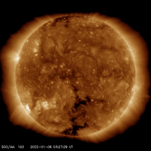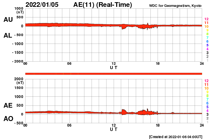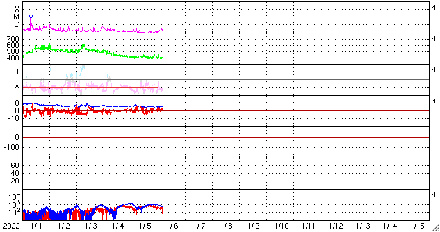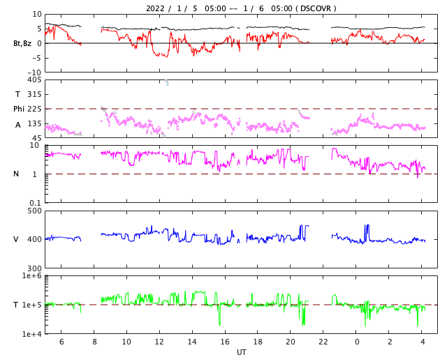 2022/ 1/ 6 13:27 更新 太陽風は平均的な状態で、磁気圏は穏やかです。 担当 篠原 太陽風は、400km/秒と平均的な速度が続いています。 磁場強度も8nTから5nTへ下がり、平均的な状態です。 磁場の南北成分は、南向きの時間帯もありますが、 全体としては北寄りになっています。 このため磁気圏は穏やかで、 AE指数は変化の少ない状態になっています。 SDO衛星AIA193では、 南極から縦に伸びるコロナホールが目立っています。 明後日くらいから影響が始まる可能性があります。 太陽は、今朝くらいから2924黒点群の黒点が増え始め、 昨日よりも目立つ姿になっています。 また、南東の端の黒点は2925群と番号が付けられています。 X線グラフは、Bクラスの小さい変化が見られる程度です。 グラフの最後の小さいフレアは2924群で発生しています。 この後、活動の強まりが見られるでしょうか。 昨日で冬休みが終わり、今日から授業です。 学校には学生たちが戻ってきました。 1か月後は後期の期末試験の真っ最中と、 これから学年の終わりに向けて忙しくなります。