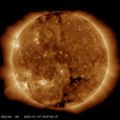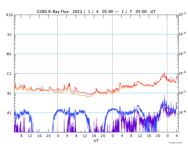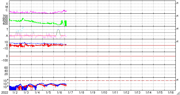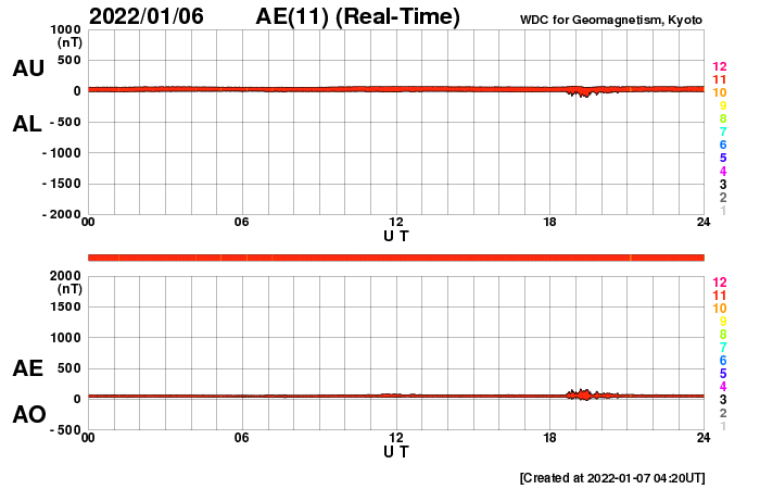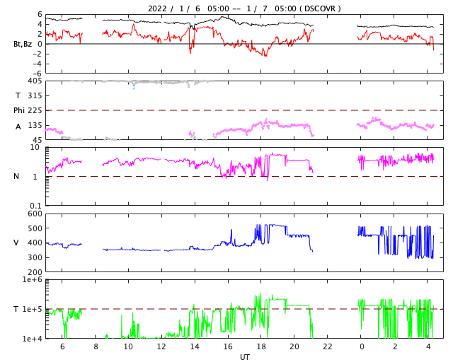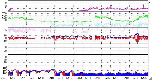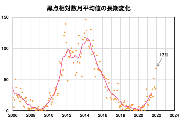 2022/ 1/ 7 13:37 更新 太陽風の速度が少し高まっている様です。12月の黒点相対数は 67.6 でした。 担当 篠原 WDC-SILSOより、 12月の黒点相対数は、67.6 と発表されました。 月平均値が60を超えるのは、2015年11月の62.2以来で、 6年ぶりです。 2019年12月に始まった第25活動周期としては、 ちょうど2年での到達となっています。 前の活動周期である第24期では、 始まって2年3か月後の2011年3月に 78.6という高まりが発生しています。 1枚目の図の2011年初めに見える、 平均の赤線から上に飛び出ている点です。 極小からの高まり方は、 今回(12月の点)とよく似た変化で周期が進行している様に見えます。 すると、今年の後半には 100を超える様な高まりが見られるかもしれません。 2枚目の図は、12月の毎日の可視光写真を繋げた動画です。 14日の2906群、2907群の出現に始まって、 月末に2916群が西の端に近付くまで、 たくさんの黒点が現れています。 この期間の黒点相対数の平均値を計算すると104となり、 半月の瞬間値ですが100台に達していました。 今年の太陽はどの様な変化をするでしょうか。 極大へ向かう高まりに注目して下さい。 現在の太陽は、南東の2924黒点群が更に大きくなっています。 X線グラフの強度も高まっていますが、 フレアの発生は特に見られず、活動は落ち着いています。 SDO衛星の可視光写真では、小さい黒点が2か所に現れています。 太陽風は、グラフの後半から速度のデータが乱れていて、 現在の状態がはっきりしません。 全体としては、450km/秒前後で変化している様で、 速度は少し高まっている様です。 磁場強度は5nTから4nTへ少し下がっていますが、 平均的な状態です。 南北成分は北寄りで推移しています。 このため磁気圏は穏やかで、 AE指数はほとんど変化がありません。 SDO衛星AIA193では、南半球のコロナホールが西に進んでいます。 速度の小幅の変化がこの領域の影響なのかどうか、 しばらく注目して下さい。