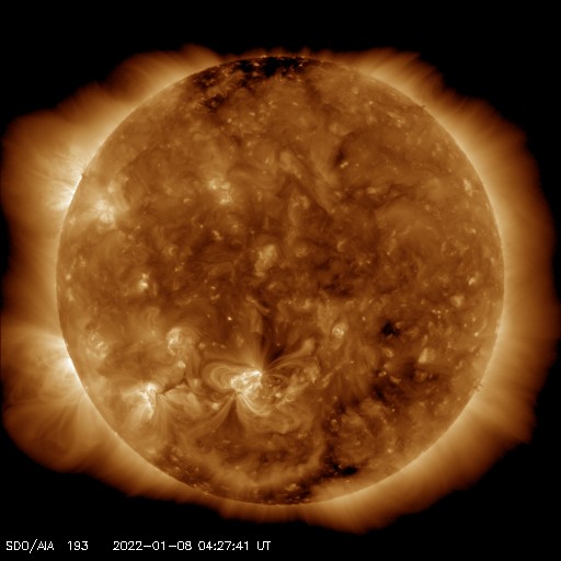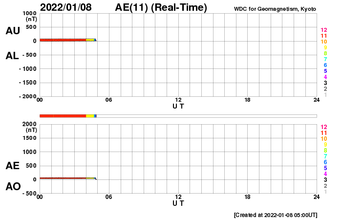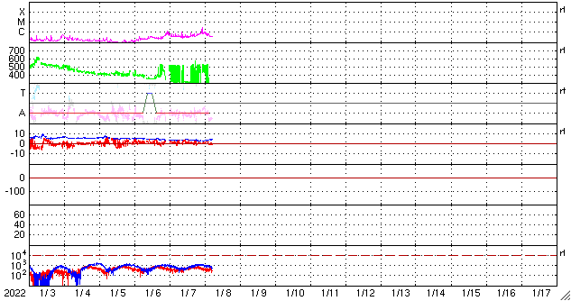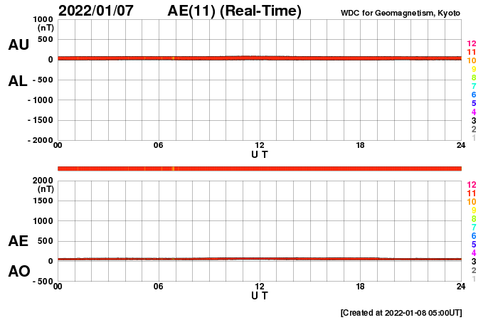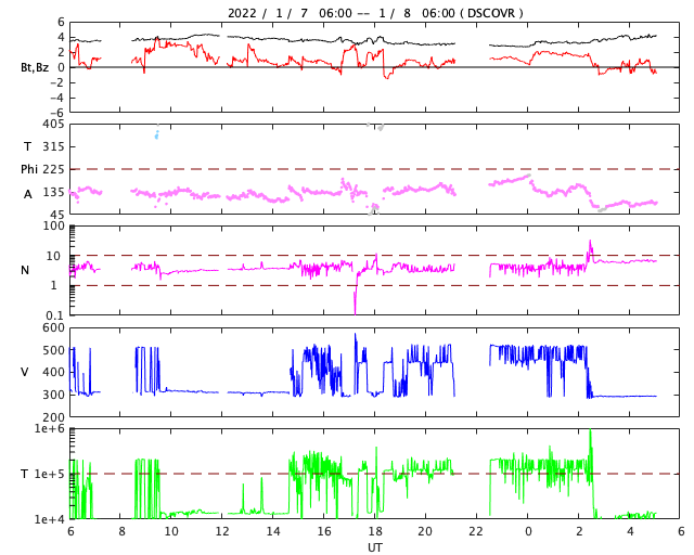 2022/ 1/ 8 14:15 更新 太陽風は低速で、磁気圏は穏やかです。太陽も穏やかです。 担当 篠原 DSCOVR衛星の速度データは乱れが続いていますが、 現在の太陽風は300km/秒と低速の状態が続いています。 昨日の太陽風も、実際には低速になっていた様です。 太陽風の磁場強度は、3〜4nTとやや弱くなっています。 南北成分は、弱い北寄りです。 速度が下がっていることと重なり、磁気圏はとても穏やかです。 AE指数は全く変化がありません。 SDO衛星AIA193では、 南半球のコロナホールは西側にだいぶ進んでいますが、 影響は見られないのでしょうか。 太陽は、2924黒点群が目立っていますが、 活動は低調で、C2.7の小規模フレアが今朝発生した程度です。 STEREO Ahead衛星によると、 太陽の東端の向こう側の南北両方から活動的な領域が近づいています。 SDO衛星AIA193の太陽コロナ写真でも明るく光っています。 どの様な領域が現れるか注目してください。