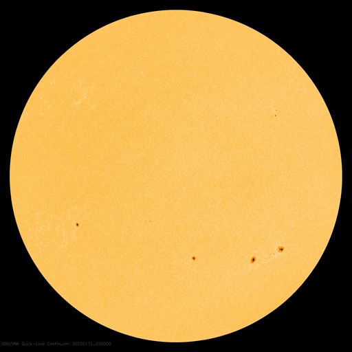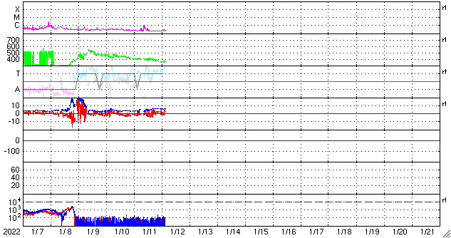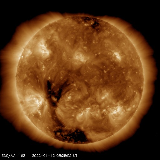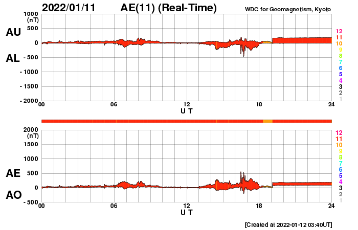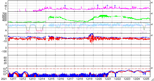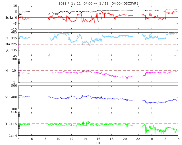 2022/ 1/12 12:55 更新 太陽風はやや低速になっています。 担当 篠原 太陽風の速度は400lkm/秒から370km/秒へ少し下がり、 やや低速になっています。 磁場強度は、5〜6nTと平均的な状態です。 磁場の南北成分は、南を向いたり北を向いたりしていて、 AE指数では、小規模の変化が発生しています。 SDO衛星AIA193では、 南極から縦に伸びるコロナホールが目立っています。 2日後くらいに中心線に達して、 その3日後くらいから太陽風の高まりが始まるかもしれません。 27日周期の図を見ると、 前周期は12月20日から23日にかけて太陽風の速度が高まっています。 今回はどの様な推移になるでしょうか。 太陽は、昨日の夕方にC1.0の小規模フレアが発生しています。 発生したのは2827黒点群の左側の領域で、 黒点は見えていません。 その他に目立った変化はなく、太陽は穏やかです。