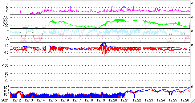(c) STEREO (NASA)、 (動画加工 : 宇宙天気ニュース) ![]() 北東の端の向こう側で発生したコロナの噴出。GOES衛星SUVI 304。 (c) GOES (NOAA)、(動画加工 : 宇宙天気ニュース) ![]() SOHO衛星LASCO C2、C3によるCMEの様子。 (c) SOHO (ESA & NASA)、 (動画加工 : 宇宙天気ニュース) ![]() SDO衛星のAIA193カメラによる太陽コロナの様子 (c) SDO (NASA) ![]() SDO衛星による太陽の可視光写真。マウスの矢印を写真に重ねると、黒点番号付きの写真に切り替わります。 (c) SDO (NASA) ![]() GOES衛星の太陽X線強度。赤・橙 = 0.1〜0.8 nm、青・紫 = 0.05〜0.4 nm (c) データ:NOAA/SWPC、作図:宇宙天気ニュース ![]() DSCOVRが観測した太陽風の磁場(黒線は全体の強度、赤線は南北成分) 磁場の向き、プラズマの密度、速度、温度 (c) データ:NOAA/SWPC、作図:宇宙天気ニュース ![]() AE指数(速報値) 下段のAEグラフの値が高くなると、オーロラ活動が活発化しています。 (c) 京都大学WDC ![]() ![]() 27日の太陽周期に合わせたデータプロット 太陽が同じ面を地球に向けていた27日前の変化から、今後を予想することができます。 (c) 作図:宇宙天気ニュース